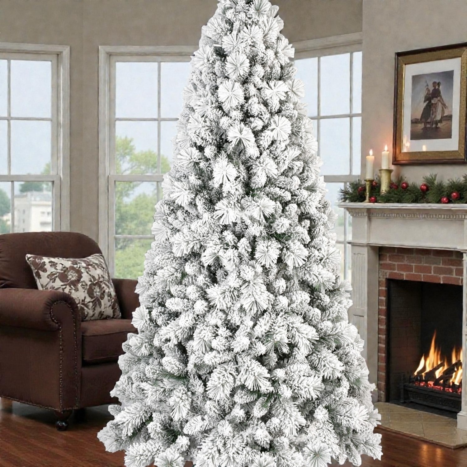 Snow-Flocked Artificial Christmas Tree with Mixed PVC Hard Needle Tips, Hinged Branches and Stable Metal Stand, 4FT-9FT