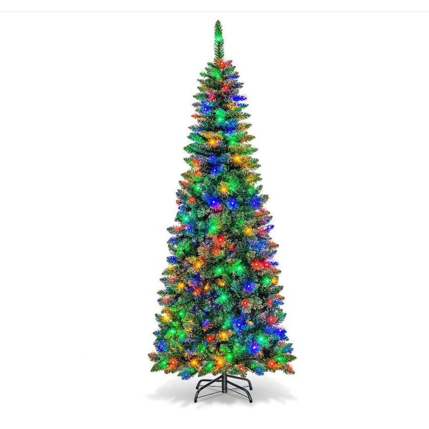 6Ft Pre-Lit Artificial Flocked Pencil Christmas Tree, Xmas Tree with LED Lights