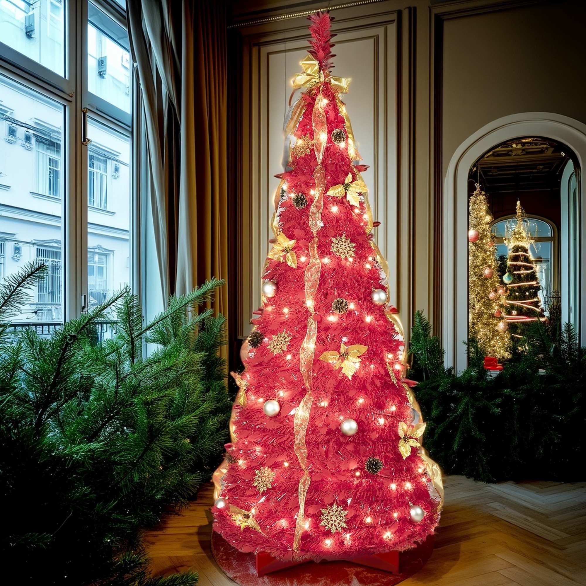 6FT Red Pop-Up Christmas Tree with 150 LED Lights & Ornaments Included - 6 Foot