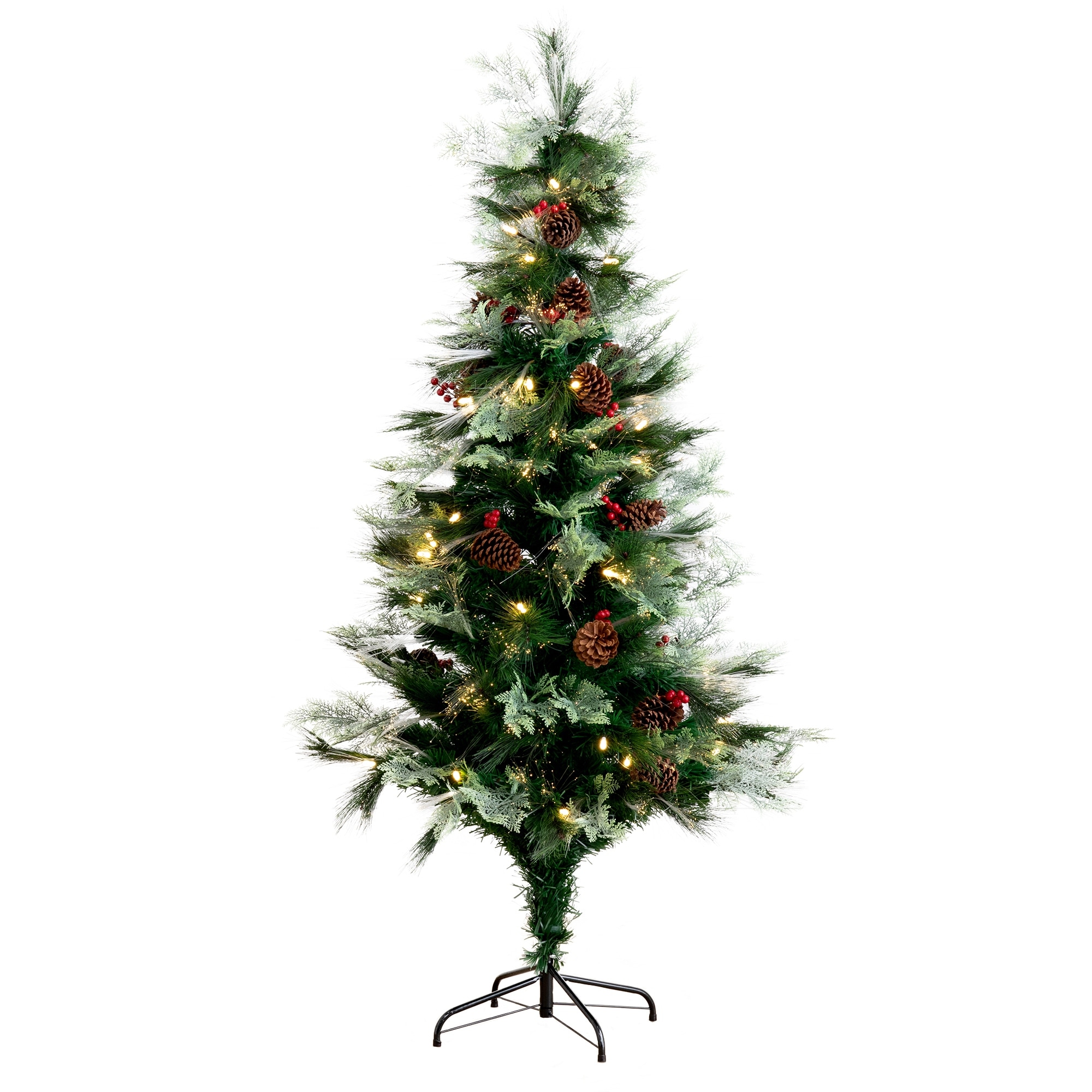 Green Pre-Lit Christmas Tree Fireproof PVC/PE Mix, Hinged Easy Assembly, Stable Metal Stand