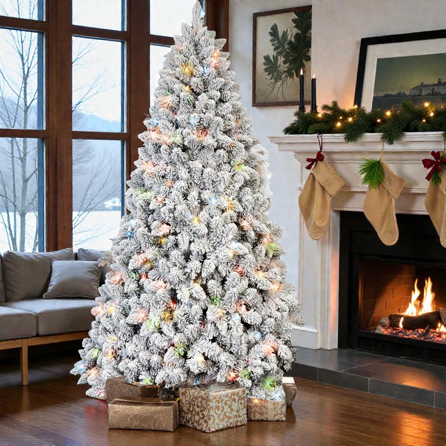 Gymax 5/6/7.5/8 ft Pre-lit Snow Flocked Artificial Christmas Tree w/