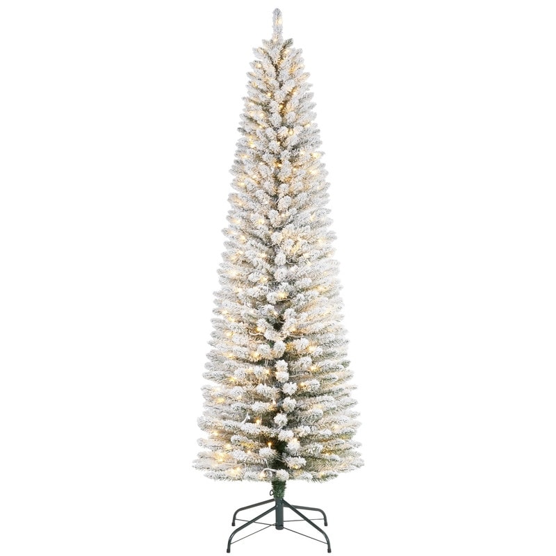 Pre-Lit Slim Noble Fir Flocked Tree with Lights, Metal Stand, Xmas Decor