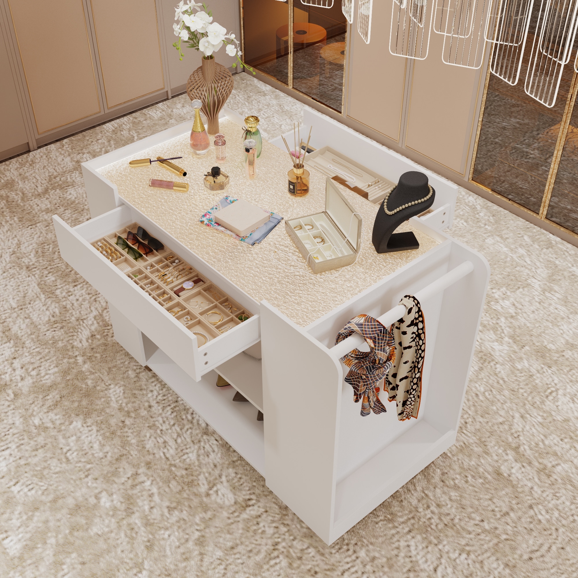 LED Light Storage Island with Wheels, Tempered Glass Countertop and Drawer for Kitchen or Closet
