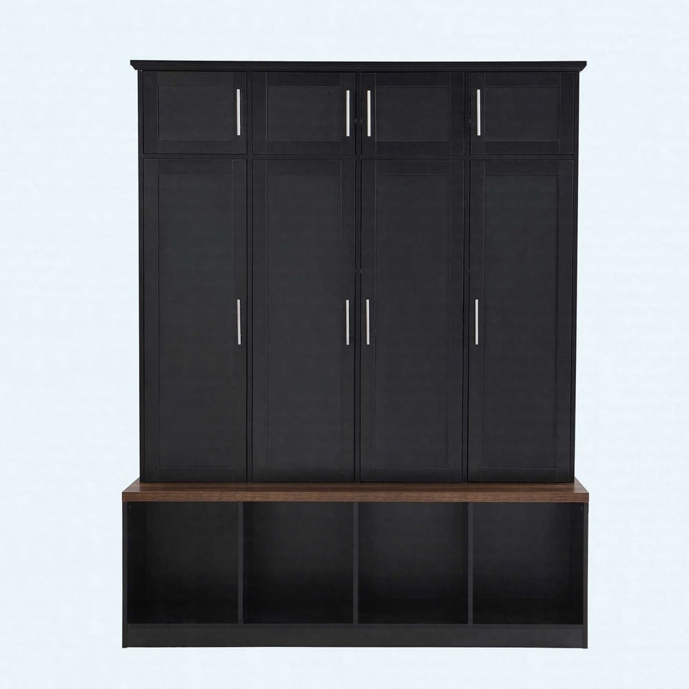 Versatile Hall Tree with 4 Hooks, Brown Wood Grain Bench & Open Storage Compartments