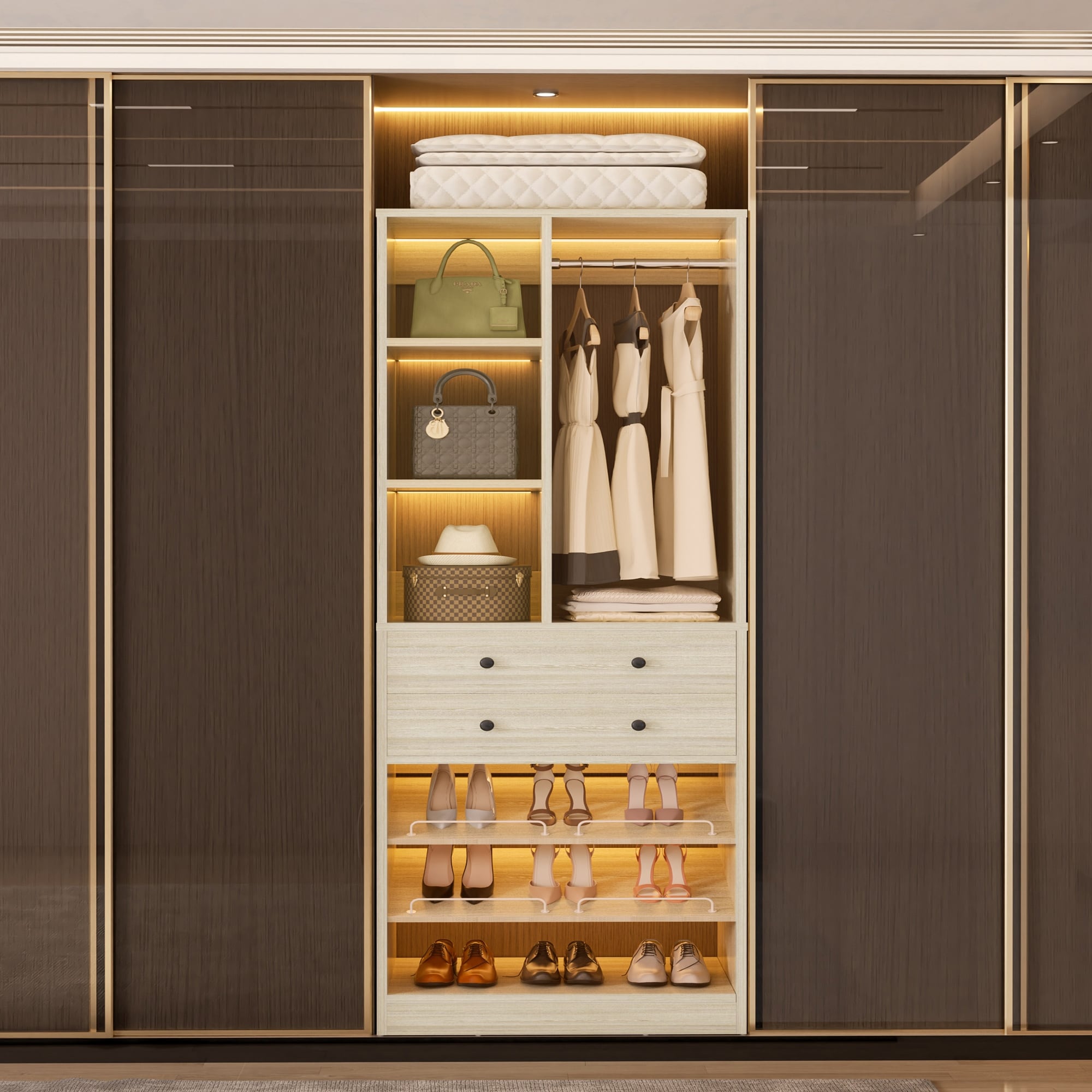 Grimm 28'' Closet Organizer with Shoe Racks and Drawers, Closet System with Hanging Rod and Adjustable Shelves