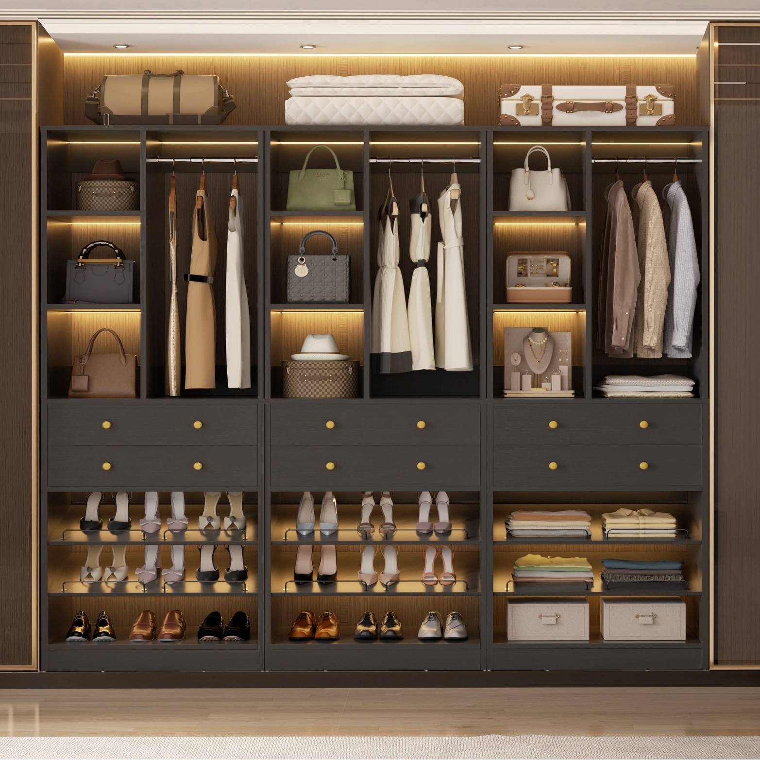 Rackcog 80"-120" W Closet System With 6 Wooden Drawers and 4 Hanging Rods,Sturdy Walk-in Closet Organizer with Storage Shelves