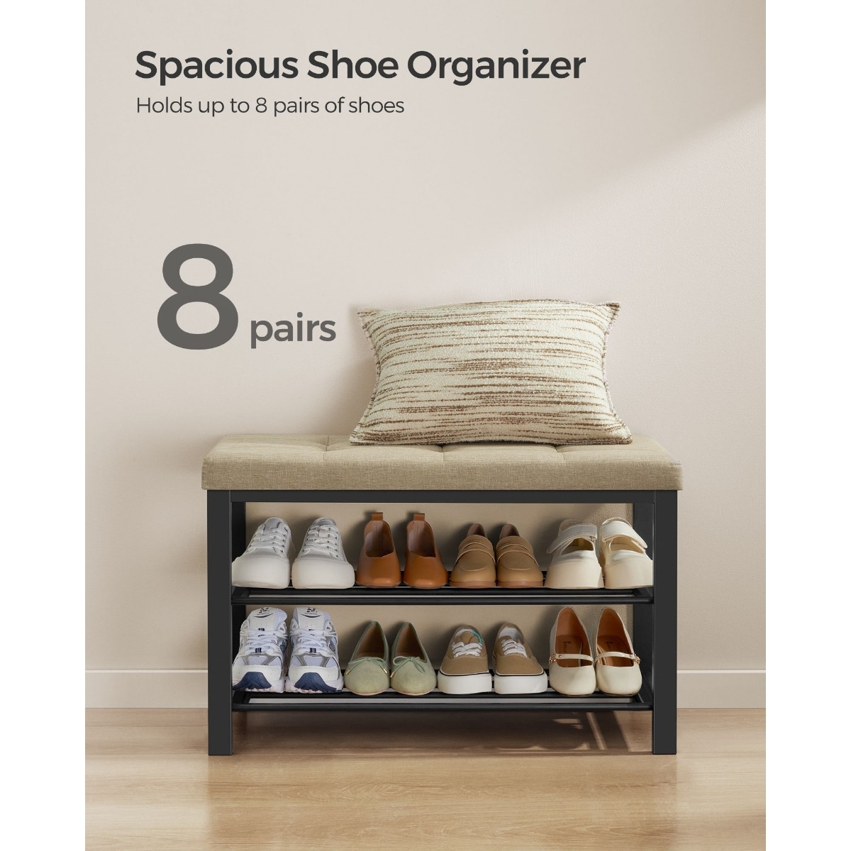 Black Metal Entryway Organizer Shelf Shoe Storage Bench with Padded Seat Perfect for Holds 8 Pairs - 12.9”D x 31.9”W x 19.3”H