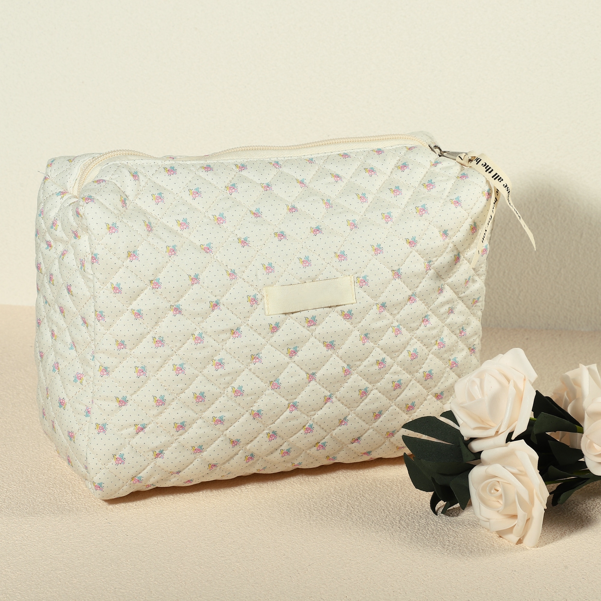 Cotton Makeup Bag Large Travel Cute Floral Pattern Makeup Bag for Women Beige - White - 10"x4"x9"
