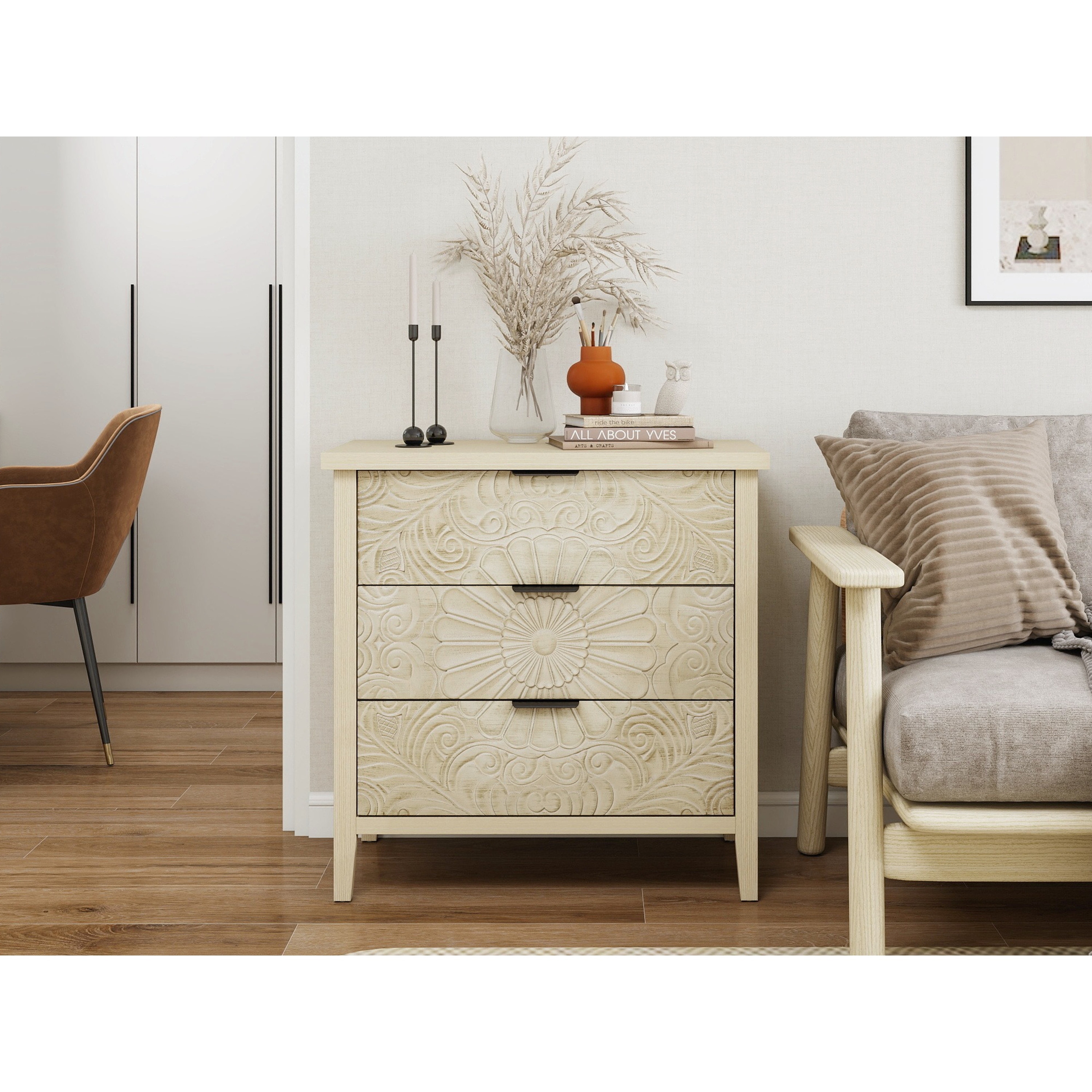 Roomfitters 3 Drawer Dresser Storage Cabinet, Carved Wood Chest of Drawers, Natural