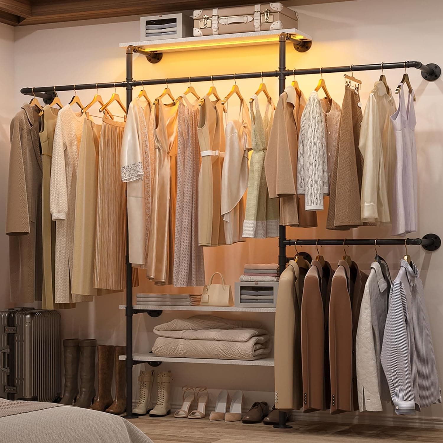 87"W Industrial Pipe Clothing Racks with LED Lights & Open Shelves,Reversible Walk-in Closet Oraganizer System Garment Racks