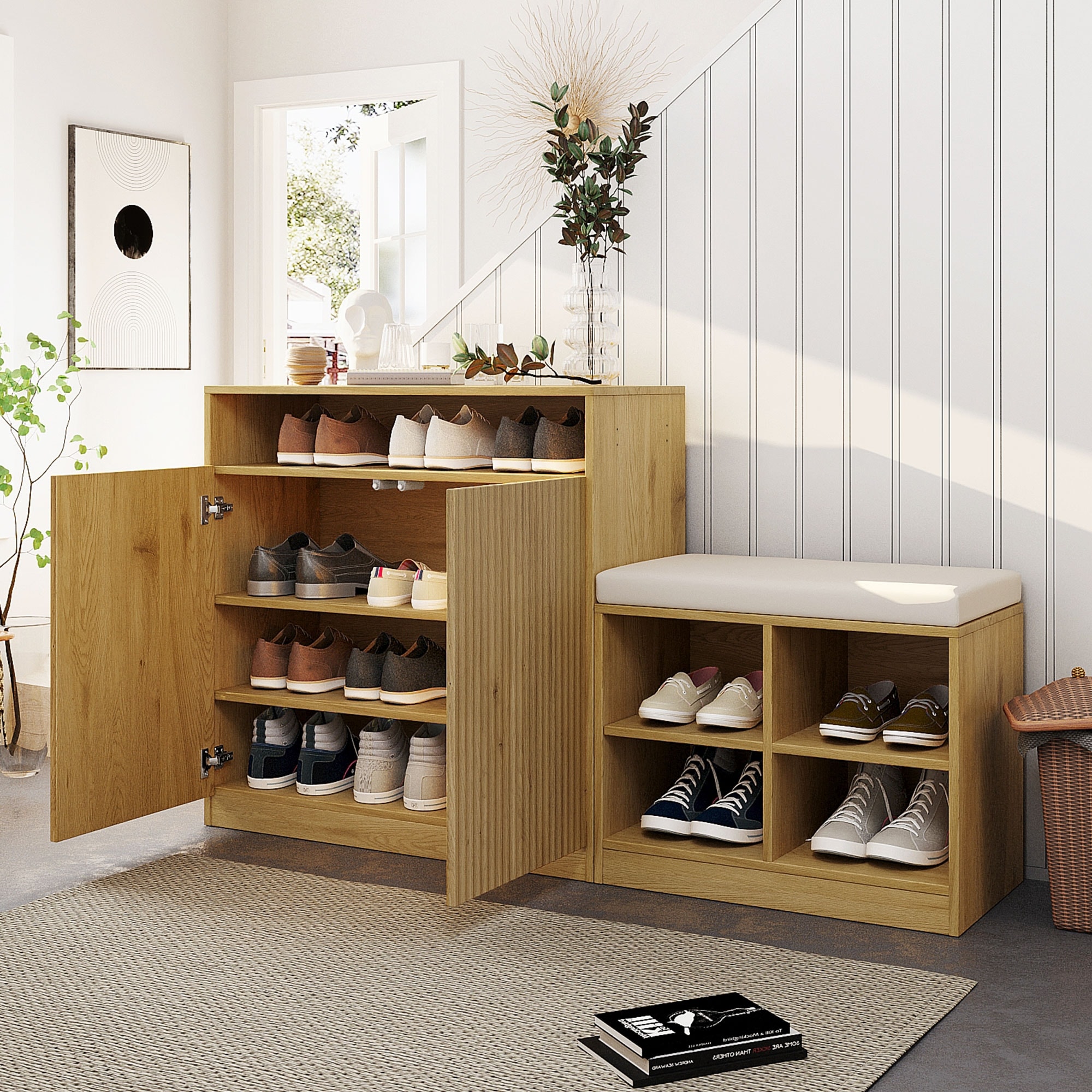 Entryway Shoe Bench Cabinet – 2 Wavy Doors, 3-Tier Adjustable Shelves, 4 Open Racks, Removable Cushion + Hooks.
