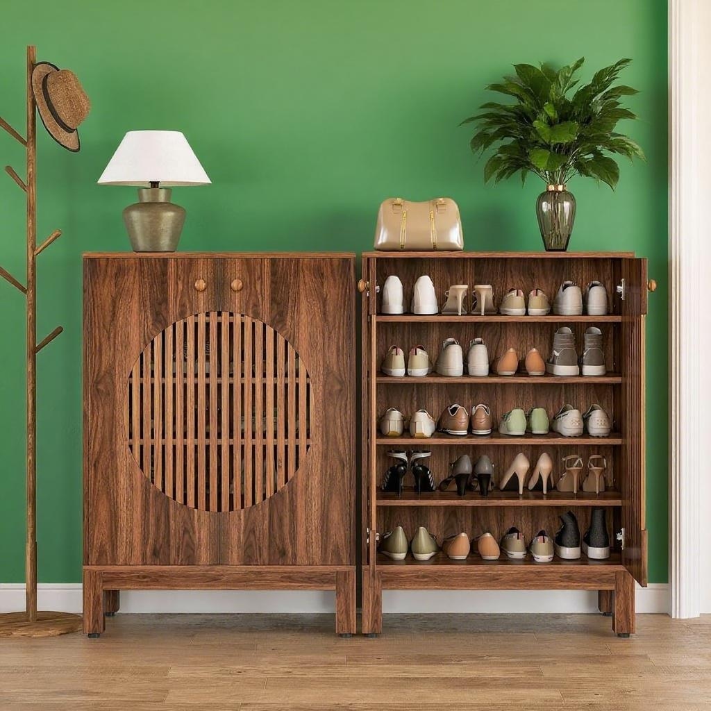 Modern minimalist double door shoe cabinet with adjustable mesh doors and high foot hollow storage cabinet bottom