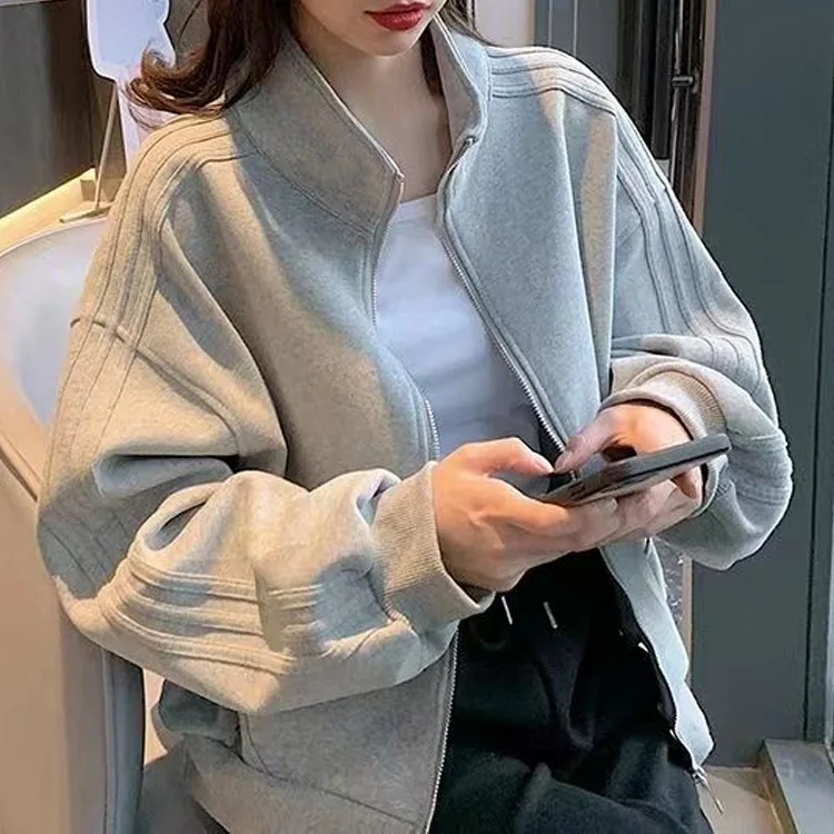 Women's Short Sweatshirt Jacket, Versatile Loose Fit Casual Style, Three Stripe Autumn Winter Jacket 2xl black