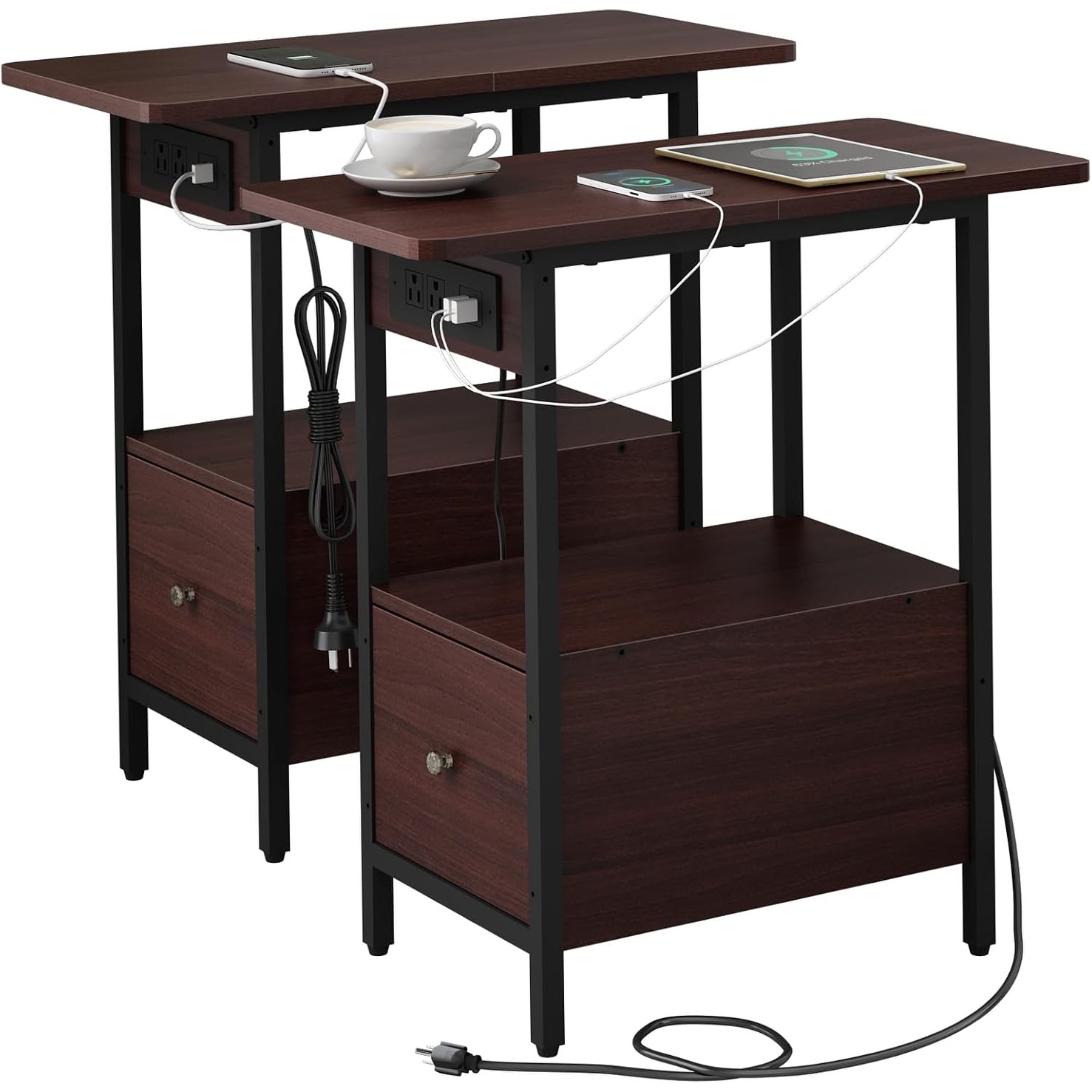 Charging Station End Table with Drawer, USB Ports & Power Outlets, Nightstand for Bedroom or Living Room, Dark Cherry, Set of 2