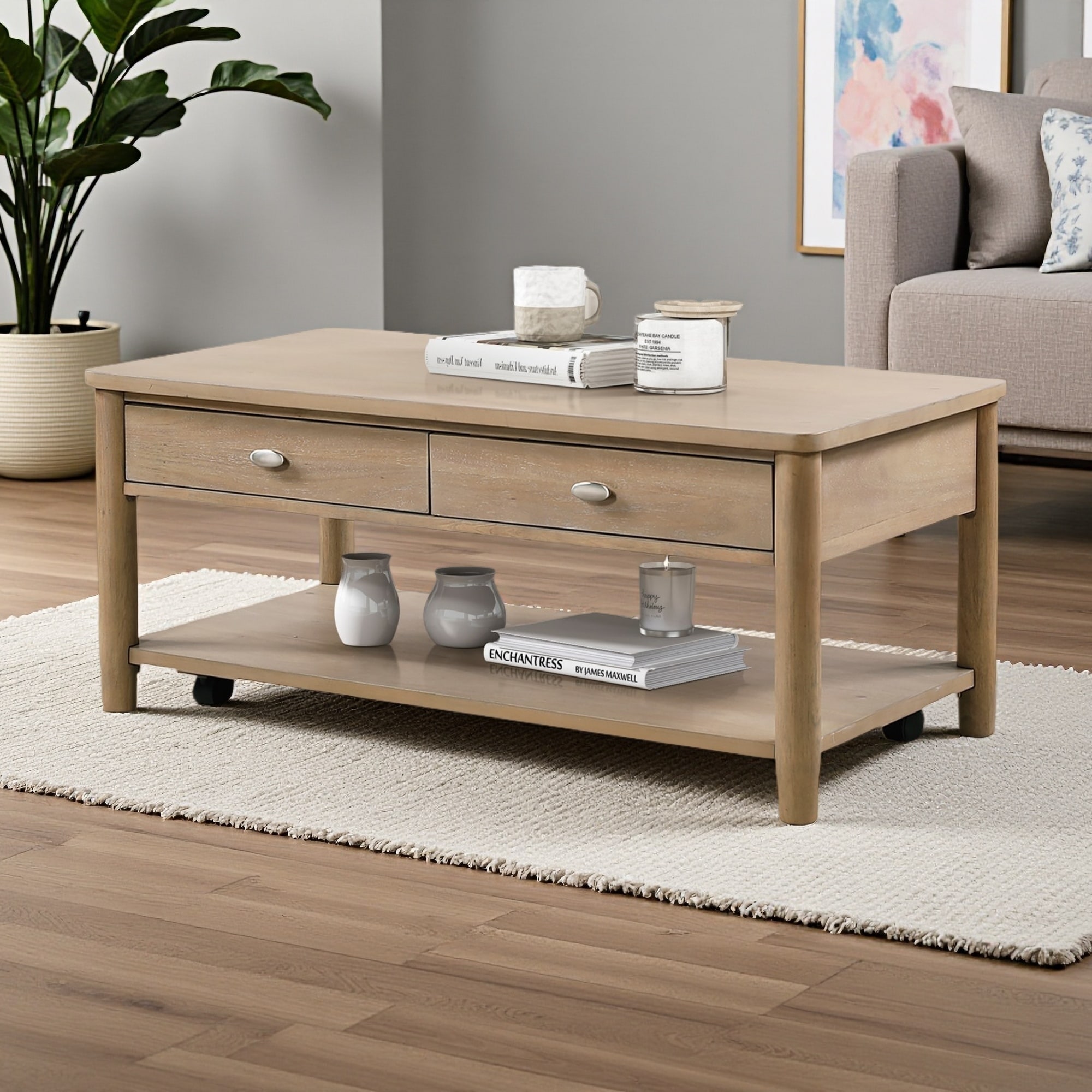 47.5" Classic Natural Finish Cocktail Table with 2 Drawers, Open Shelf, and Casters Wooden Living Room Furniture Centre Table