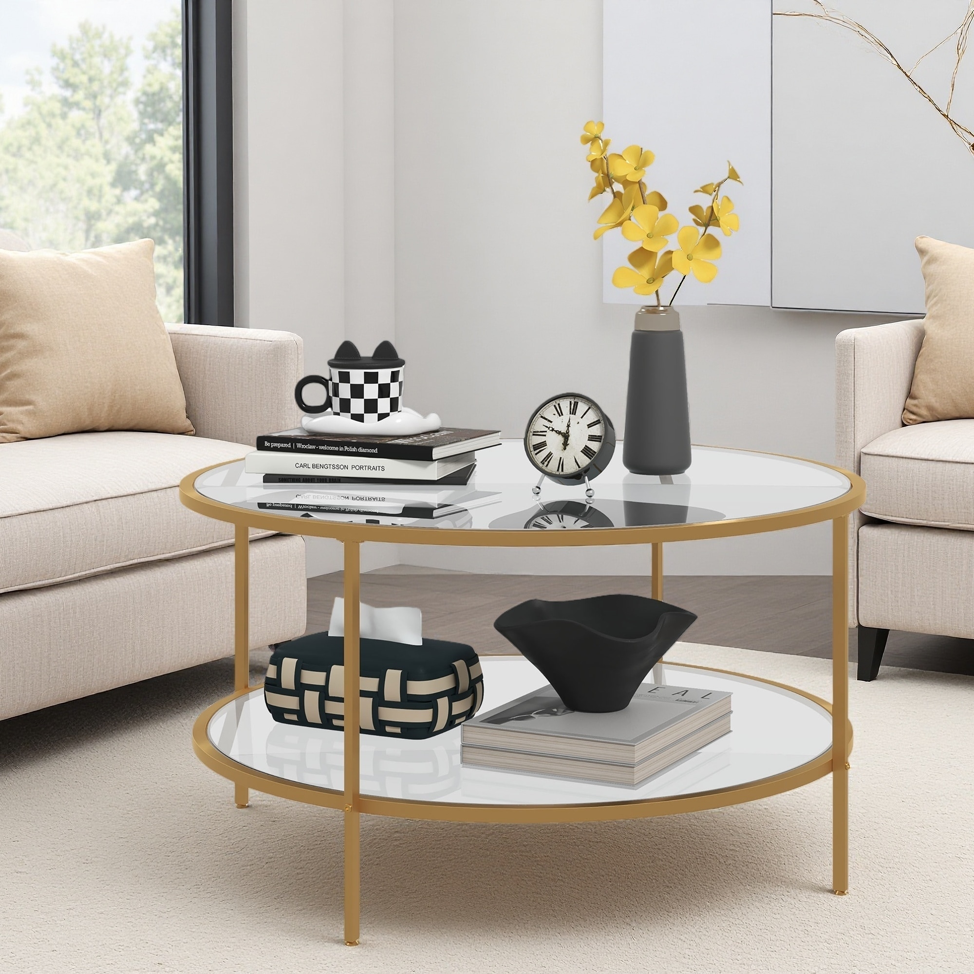 32" Tempered Glass 2-Tier Side Table with Steel Frame and Storage, Round End Table for Living Room