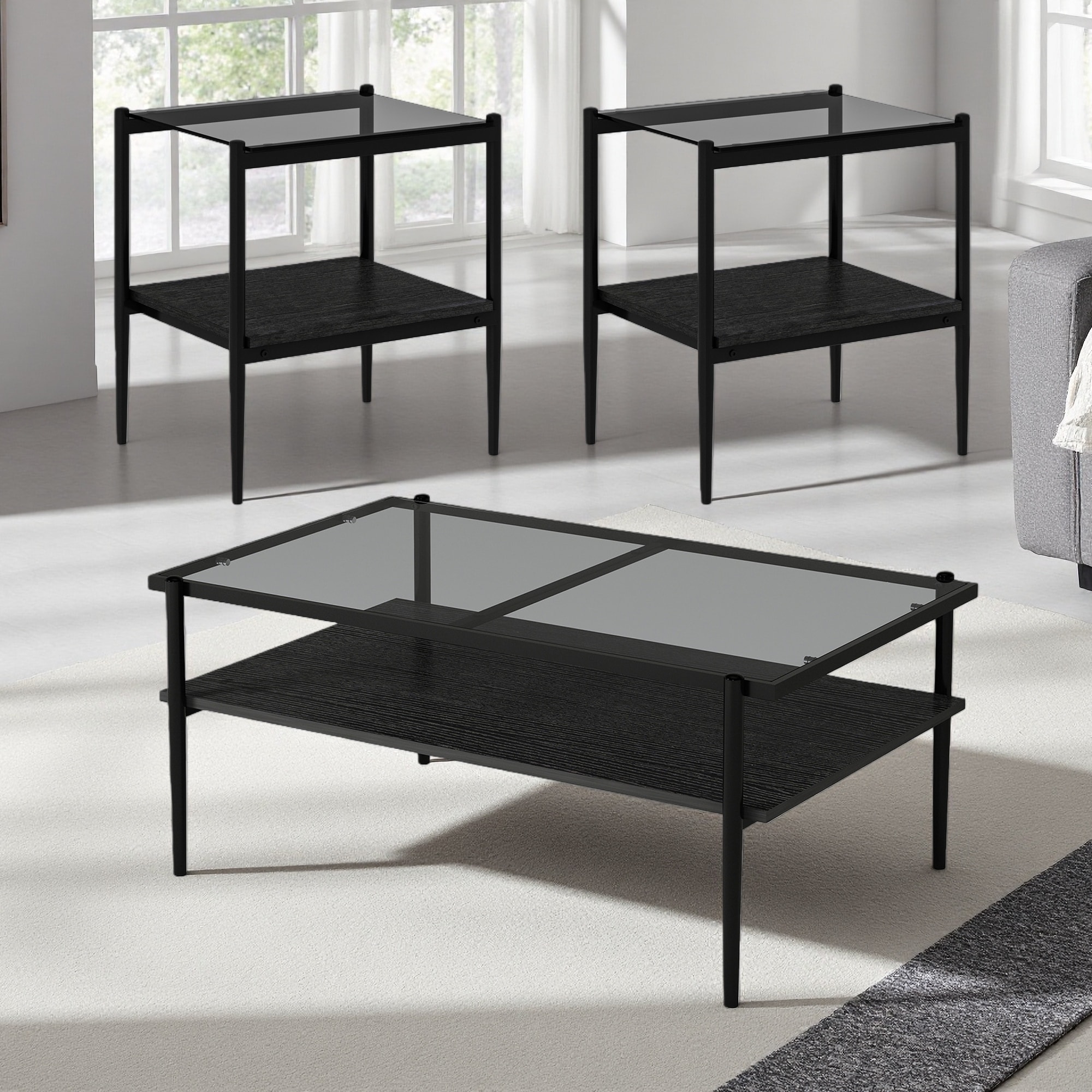 38.39" Coffee Table and 2 End Tables Set with Gray Tempered Glass Tops, MDF Layers, Modern Living Room Tables with Iron Legs