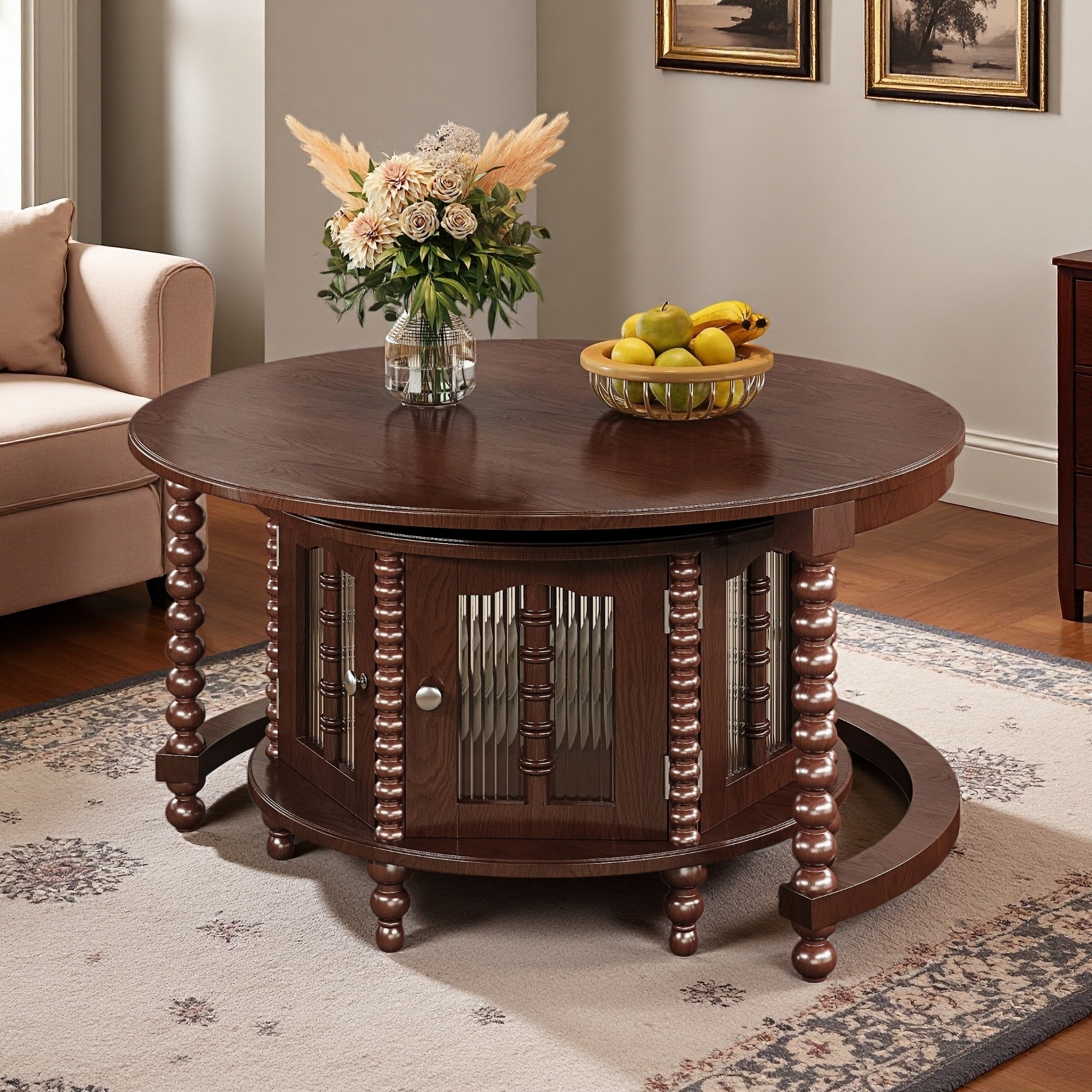 Vintage Round Nesting Coffee Table with Bamboo-Shaped Glass Doors and Retro Beaded Legs, Ideal for Living Room or Lounge
