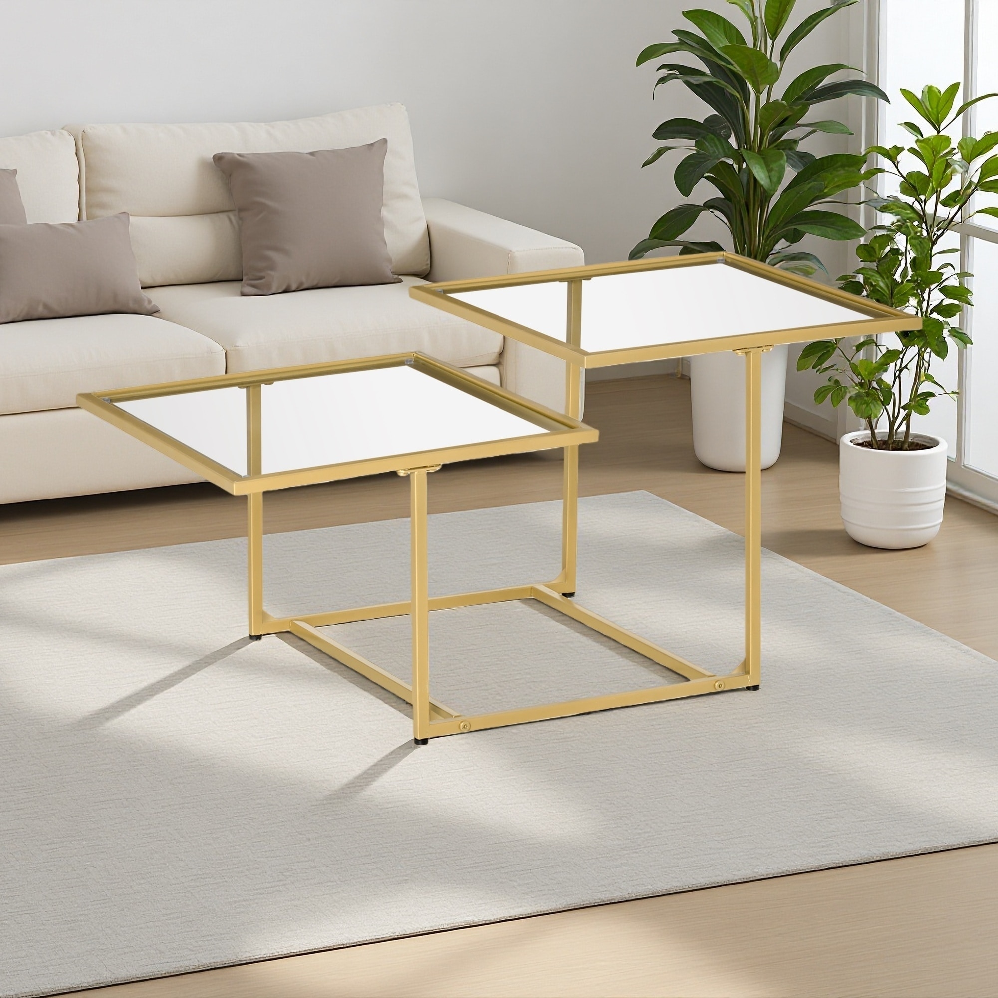 37.75" Tempered Glass Coffee Table with 2 Square Tabletops, Modern Living Room Coffee Table for Bedroom, Gold Metal Frame