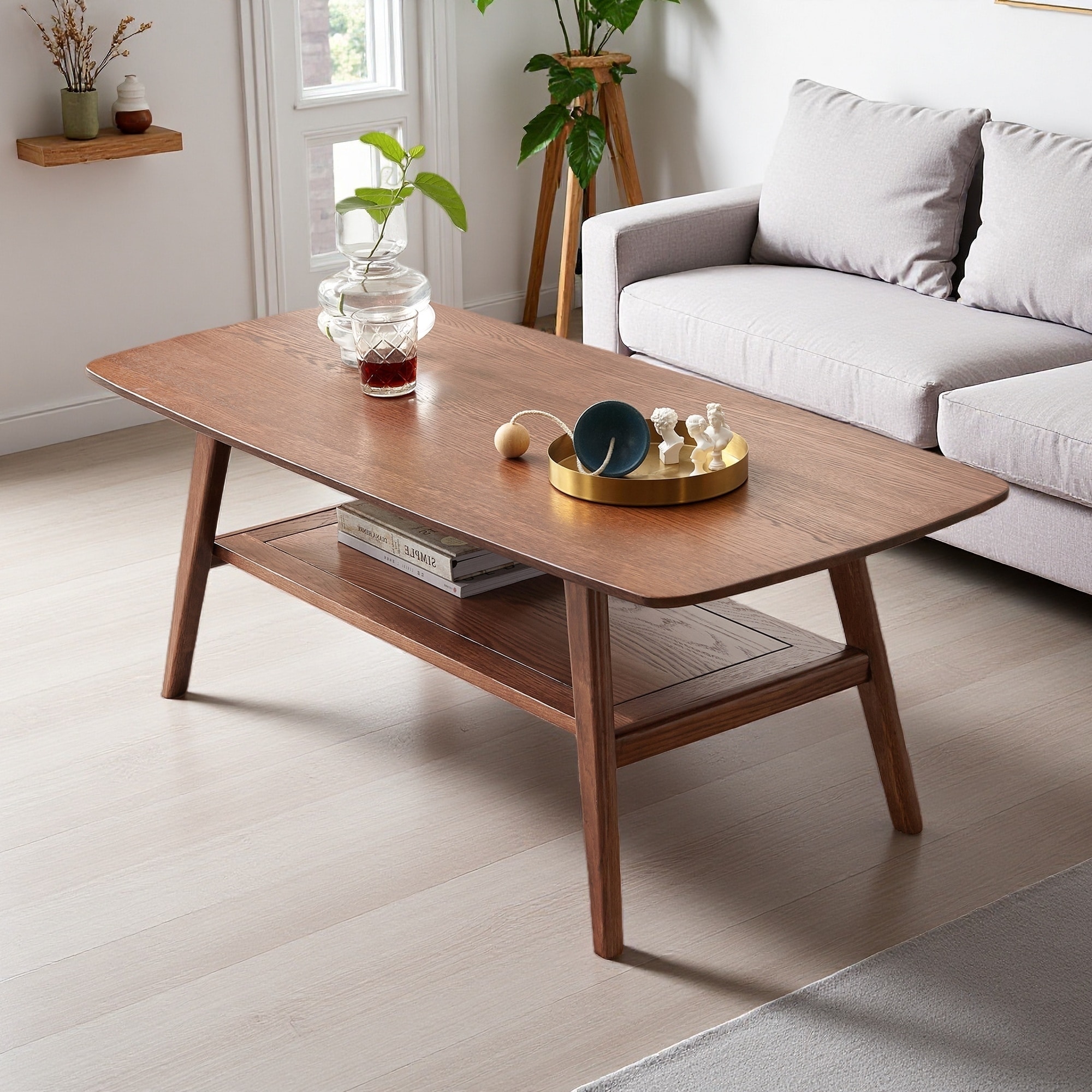 31.5" Solid Wood Coffee Table with Dual-Layer Storage and Rounded Corners with Natural Finish and Easy Assembly
