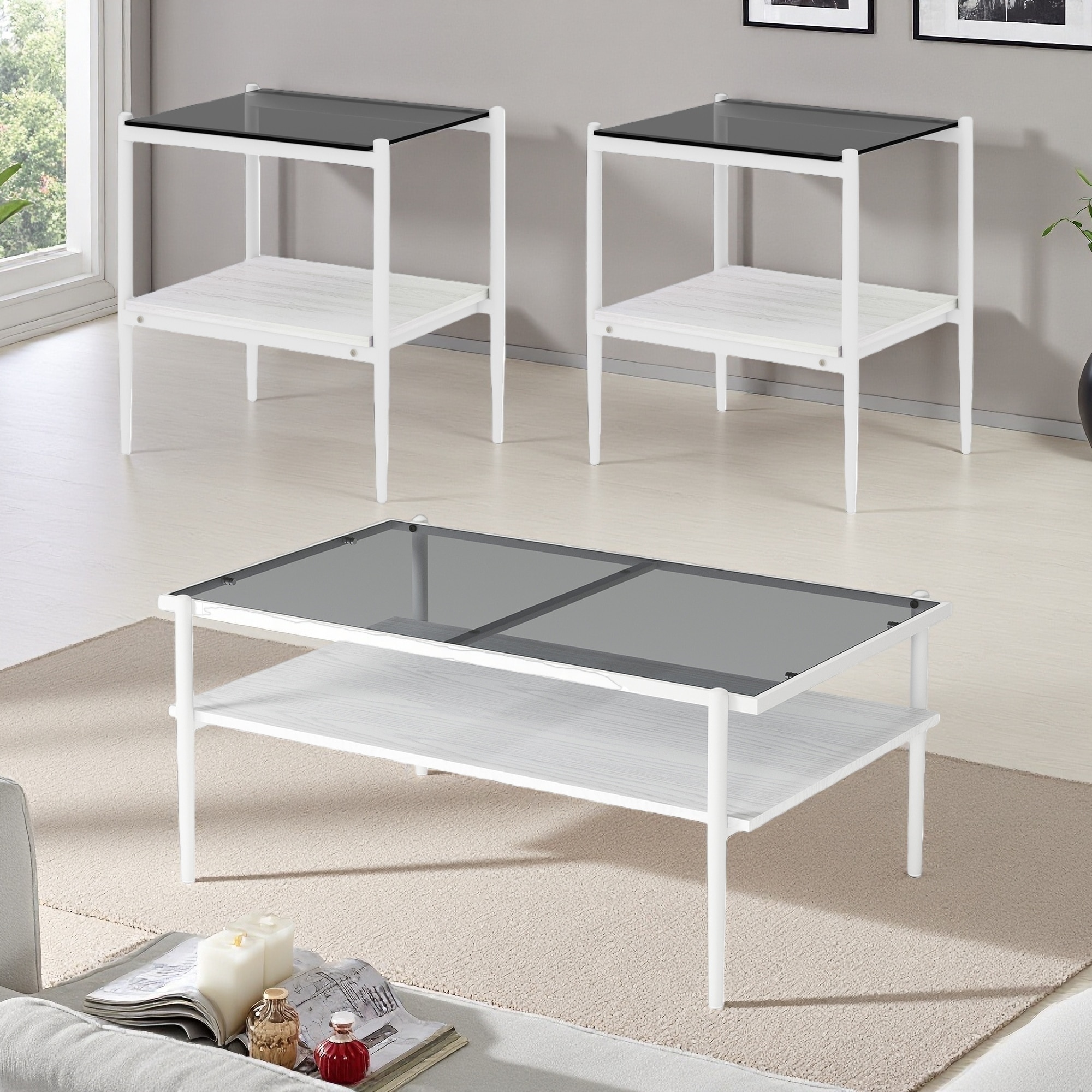 38.39" Coffee Table and 2 End Tables Set with Gray Tempered Glass Tops, MDF Layers, Modern Living Room Tables with Iron Legs