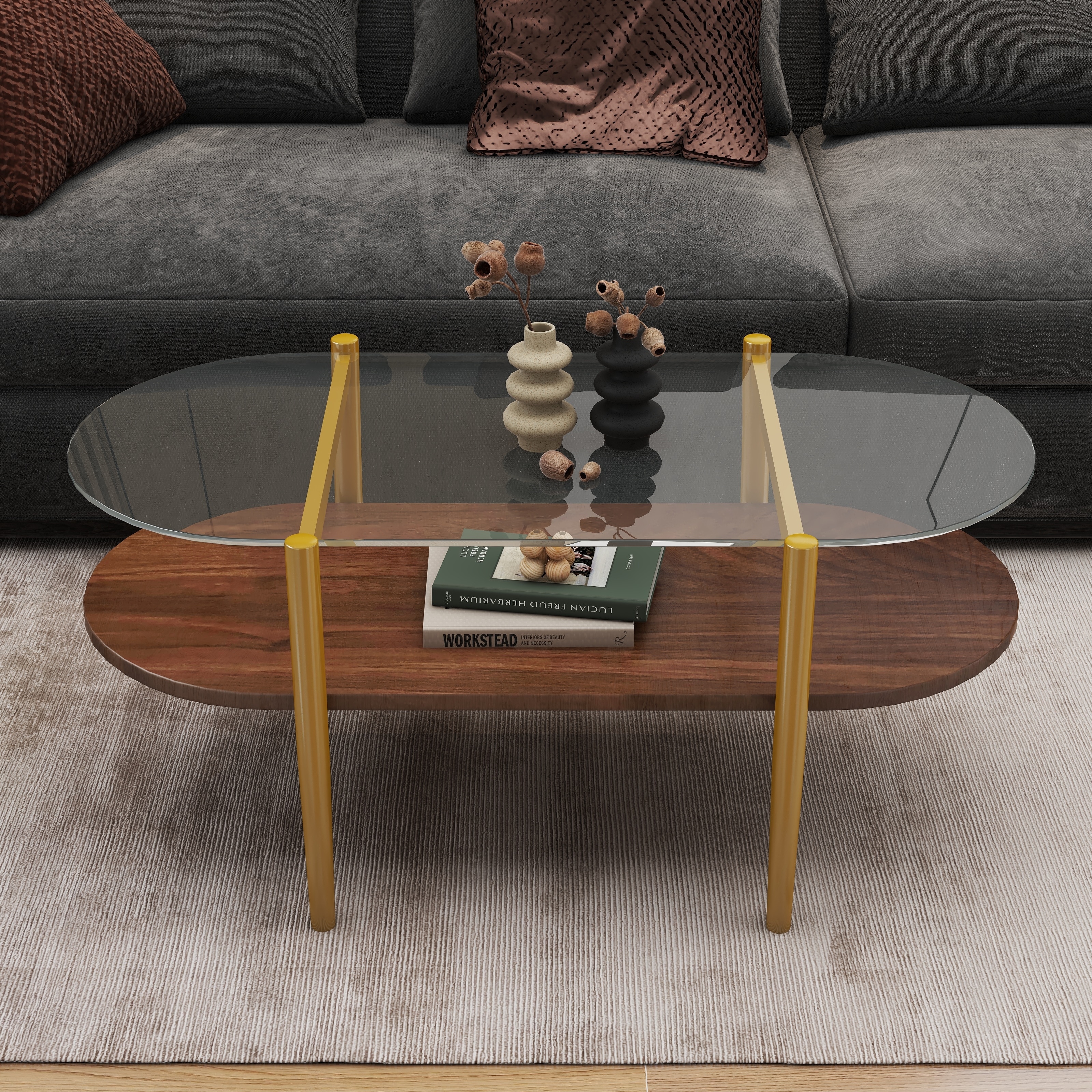 Oval Glass Coffee Table Mid-Century Modern Design Two-Tier Structure