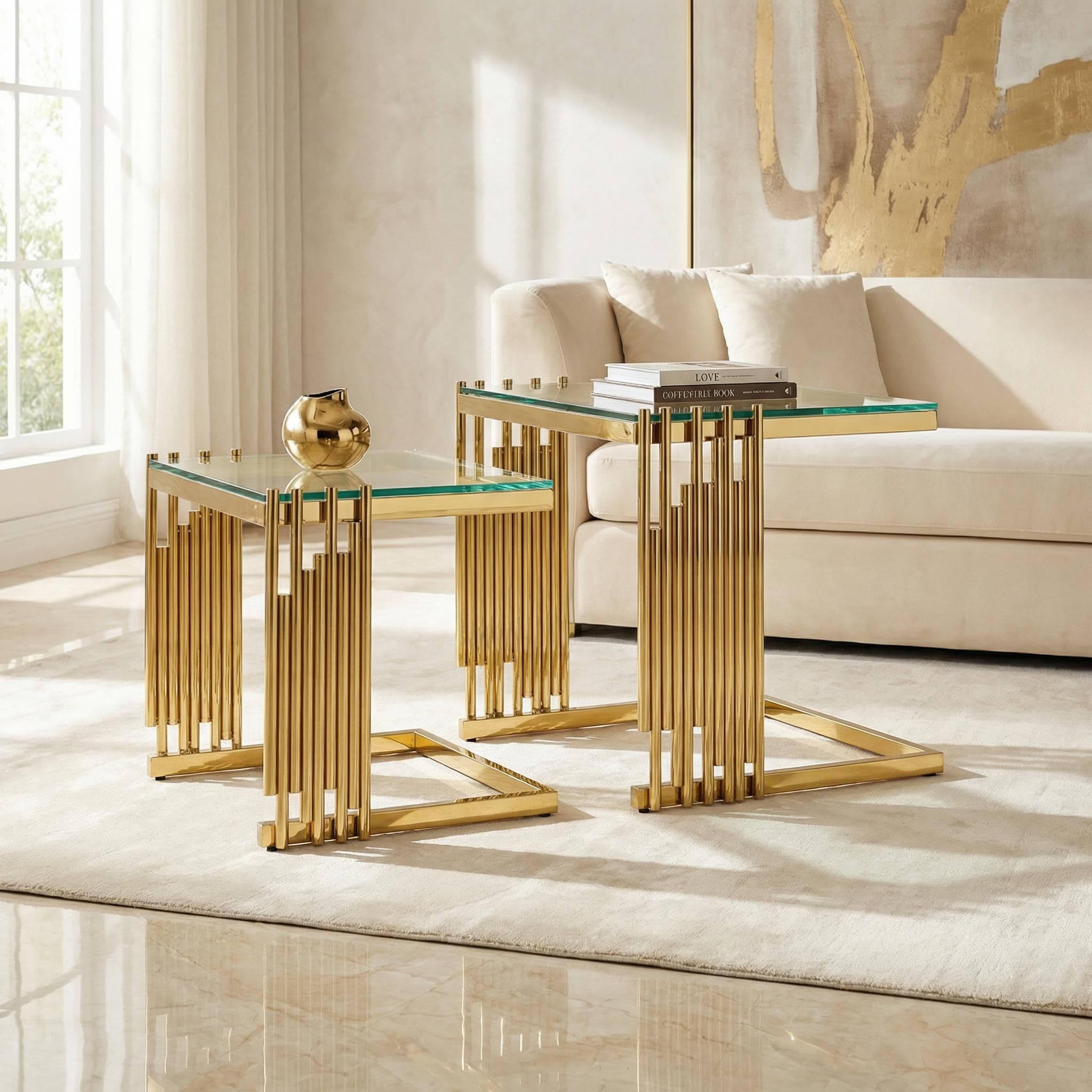 2 Pieces Gold Cofee Table Set, Tempered Glass Top With 201 Stainless Steel Frame, Modern Accent Coffee Table