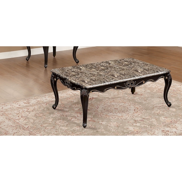 Transitional Style Coffee Table Marble Top Cabriole Legs Golden Highlight Curved Details Dark Walnut Finish