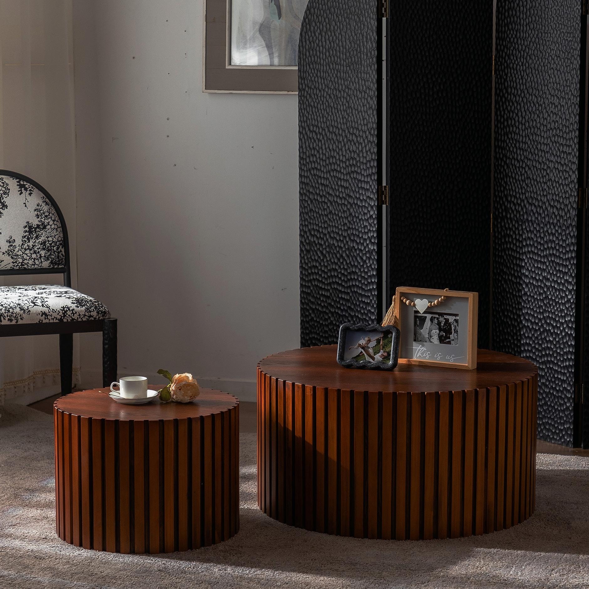 Round Relief Coffee Table for Living Room, Accent Coffee Table with Pedestal, Mid Century Modern Wood Circle Center Tea Table