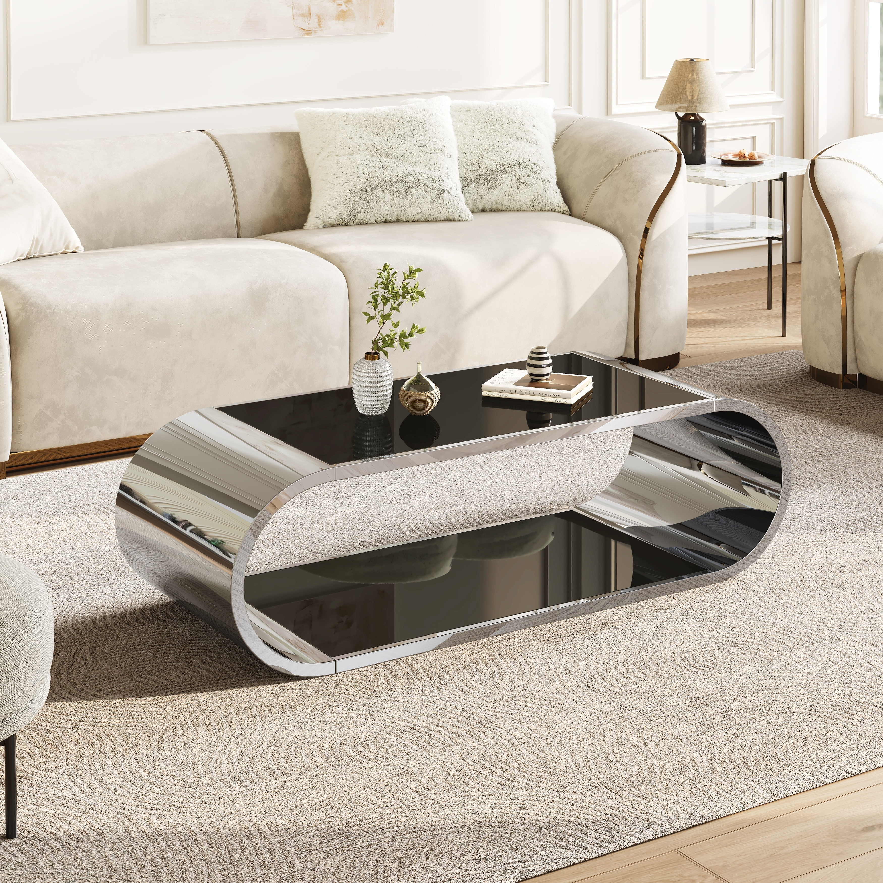 57" Silver Stainless Coffee Table with 2-Tier Glass Top