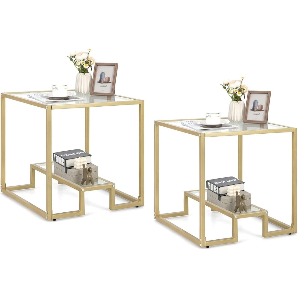 Set of 2 Gold Square Glass Nightstands with Storage Shelf