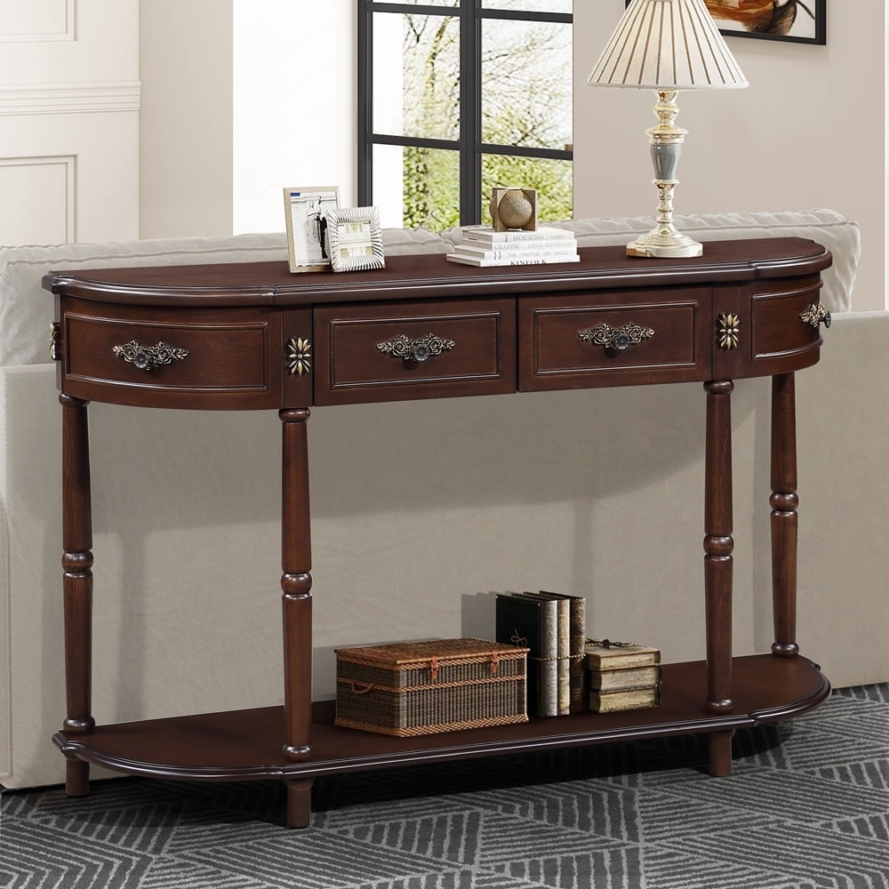 Retro Curved Wood Sofa Table Console Table with Open Shelf and 2 Drawers