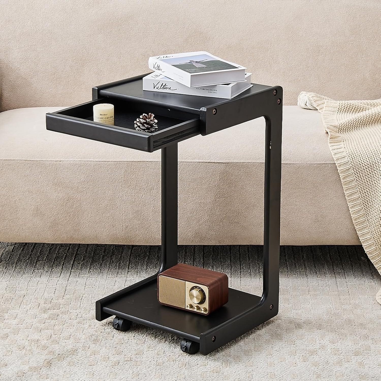 Modern C-Shaped Rolling Side Table with Drawer, Rubberwood Construction, 13x14.4x26 Inches