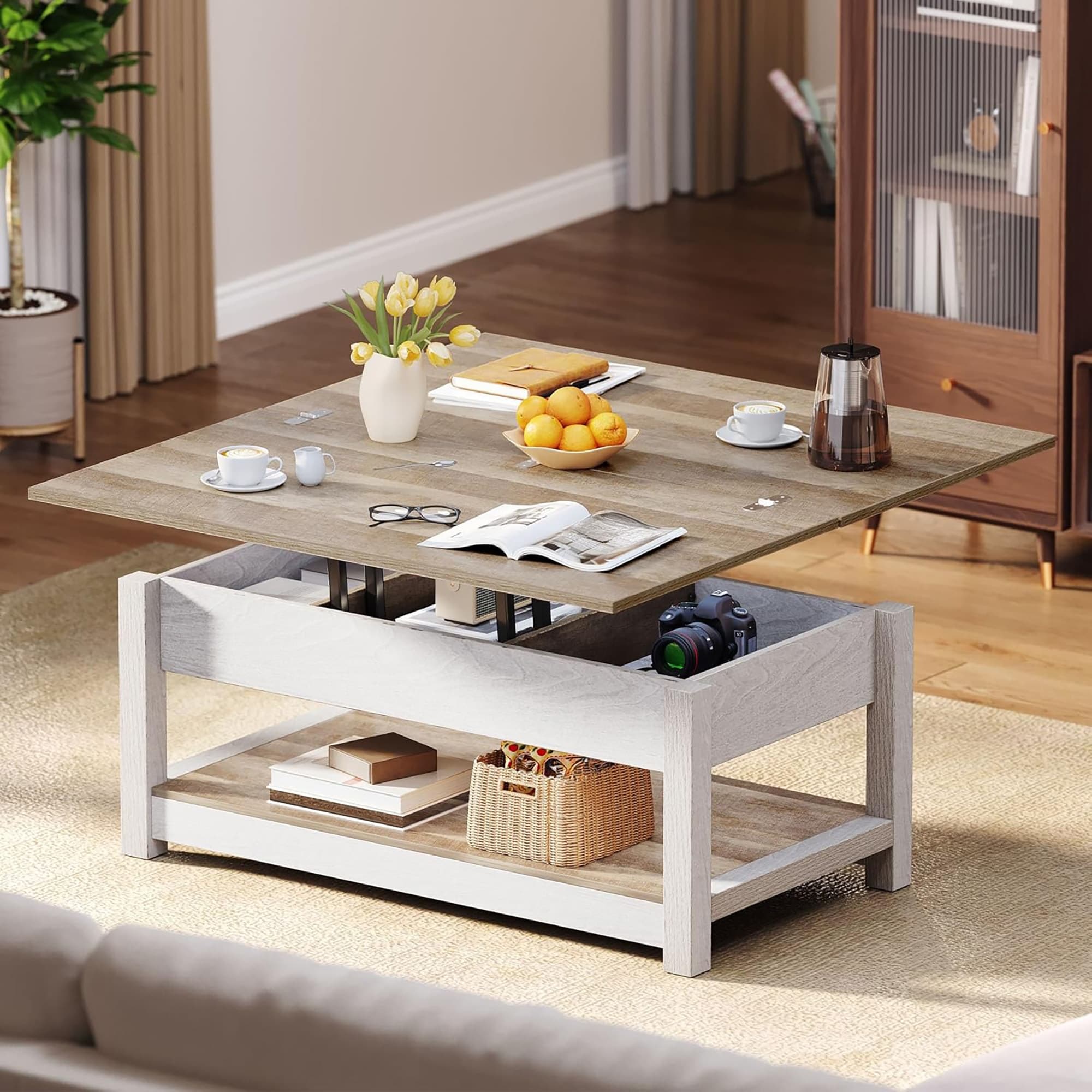 Moasis Farmhouse Lift Top Coffee Table Dining Table with Hidden Storage and Shelf