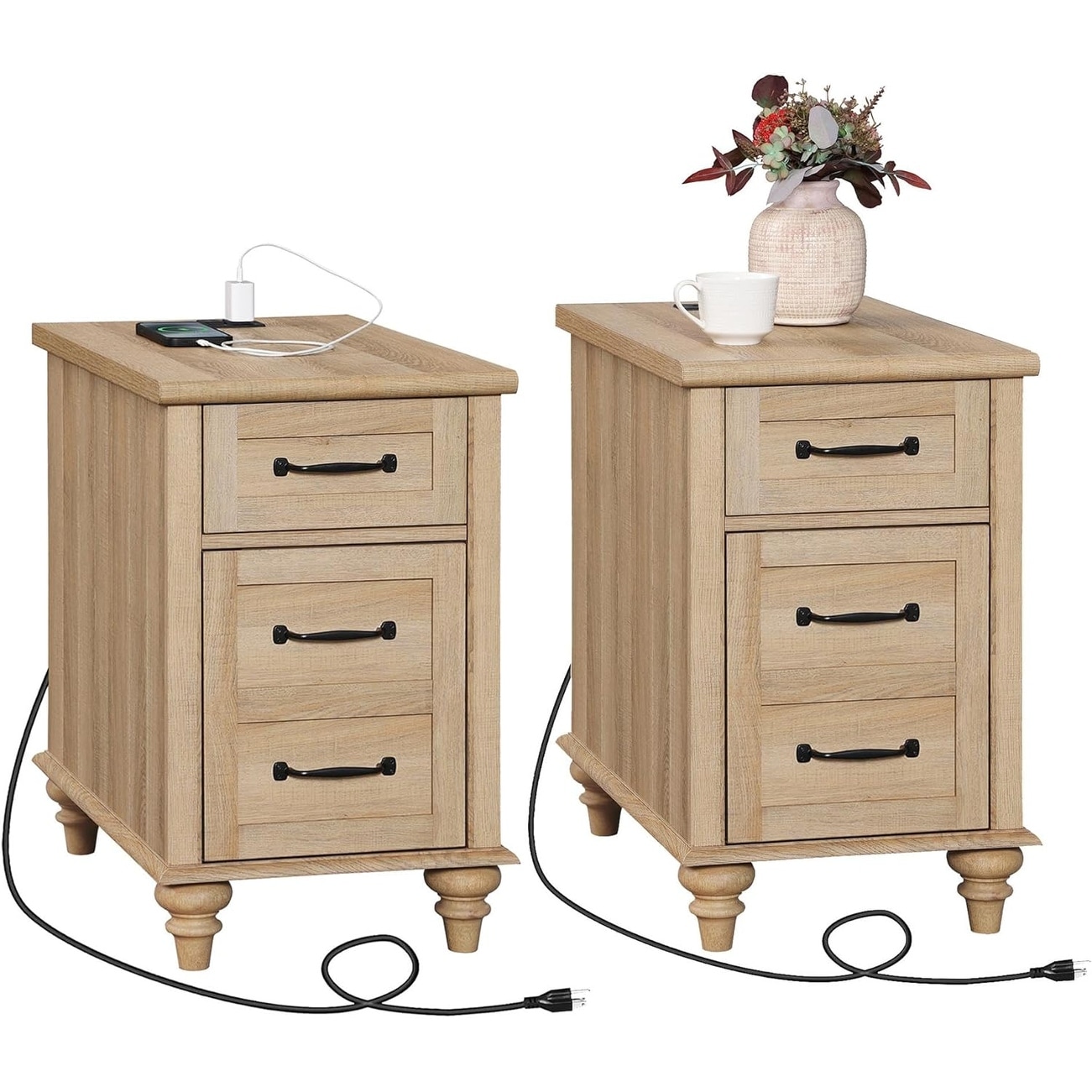 Set of 2 Oak Nightstands with Charging Station, Storage Drawer, and Farmhouse Design