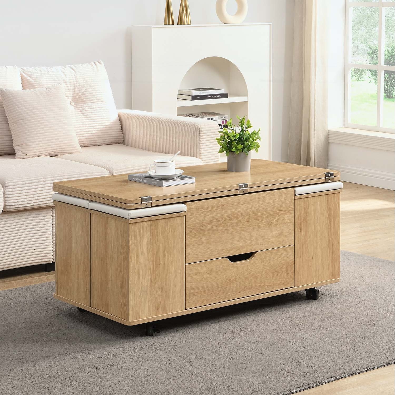 Multi-Functional Lift-Top Coffee Table with Hidden Storage and Stools,Perfect for Modern Living Spaces.