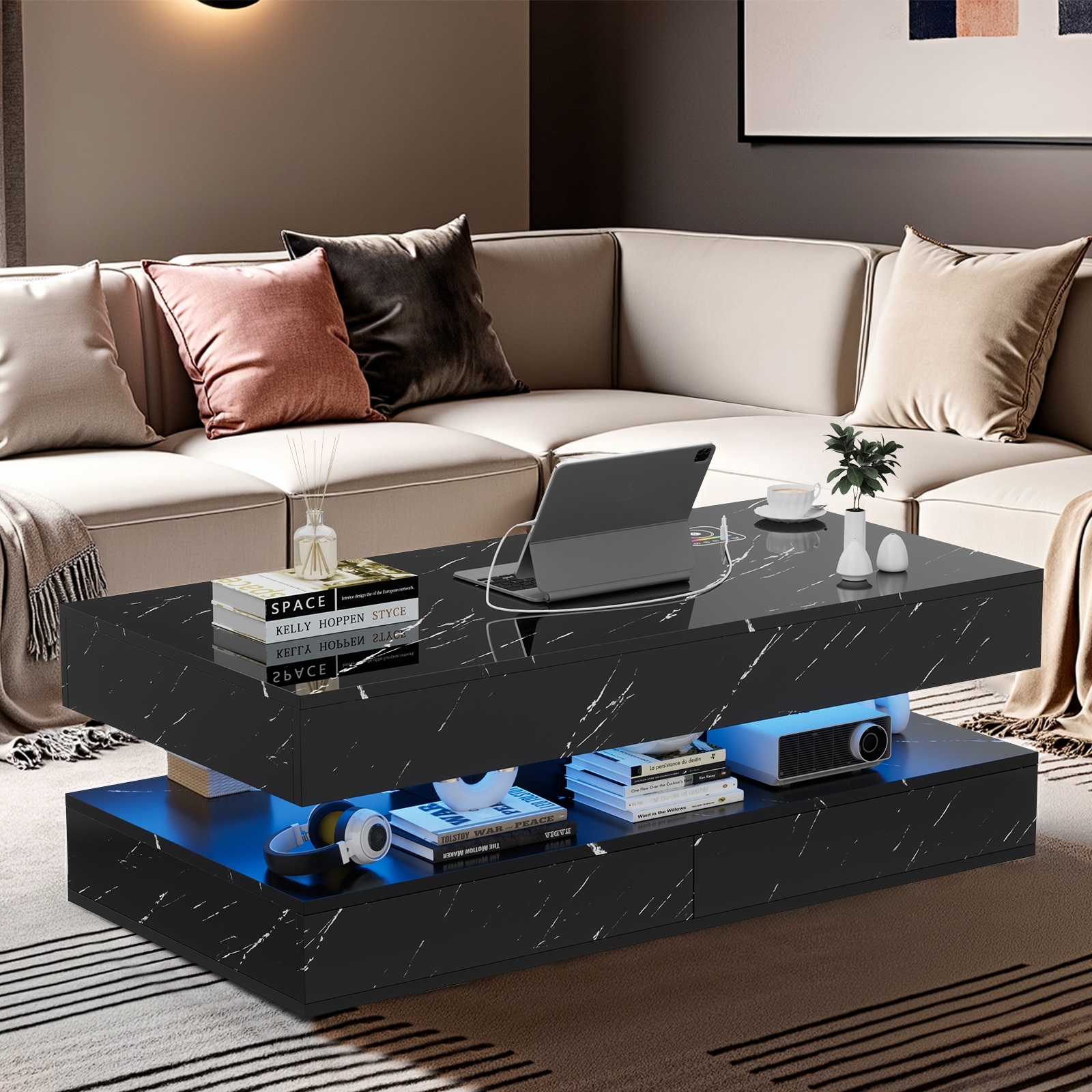 Pocassy Double-Layer Center Tables with LED Light 47.2 Inch