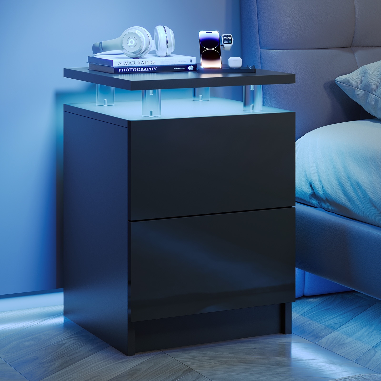 Nightstand with LED Lights, Night Stand with 2 Storage Drawers