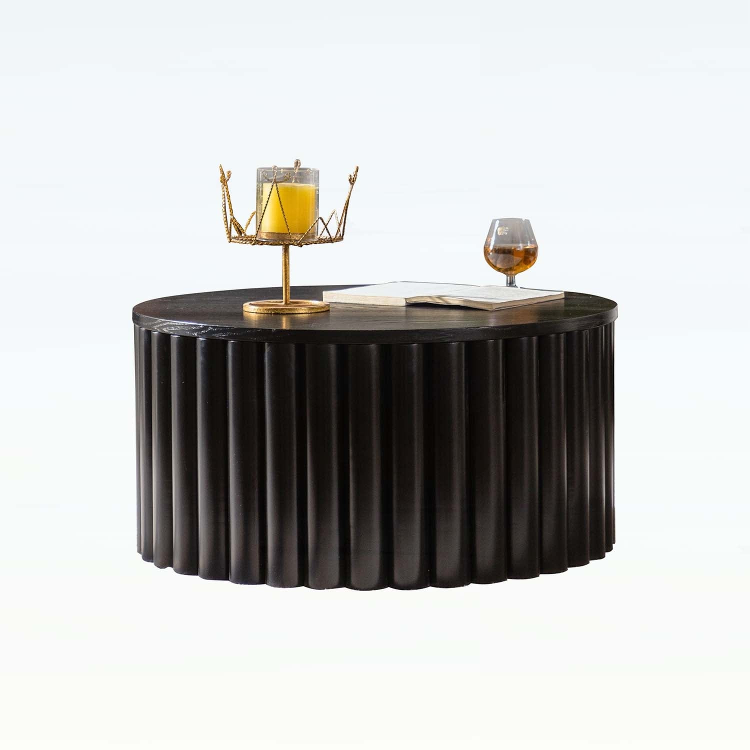 Oval Wooden Coffee Table with Handcrafted Relief and Sturdy Pedestal for Living Room