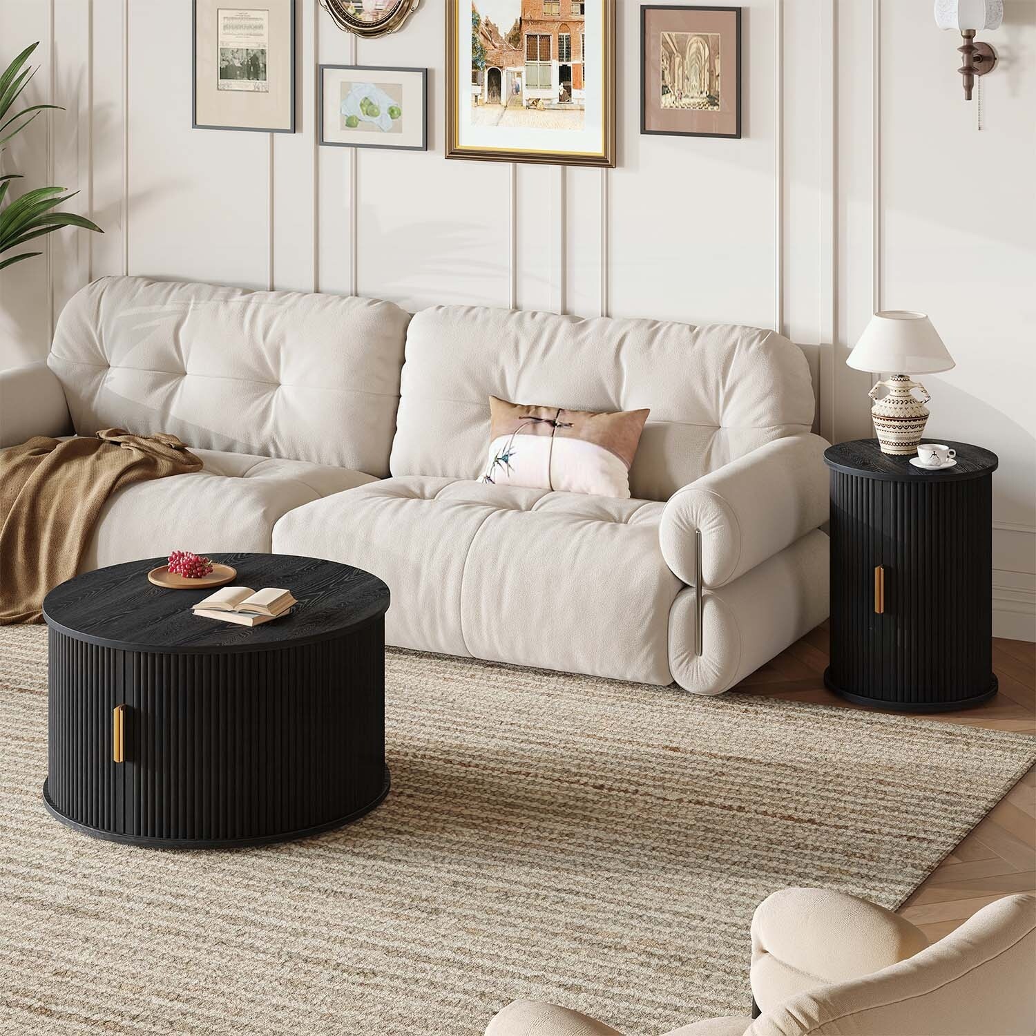 Round Fluted Coffee Table Set with Storage,Golden Handle