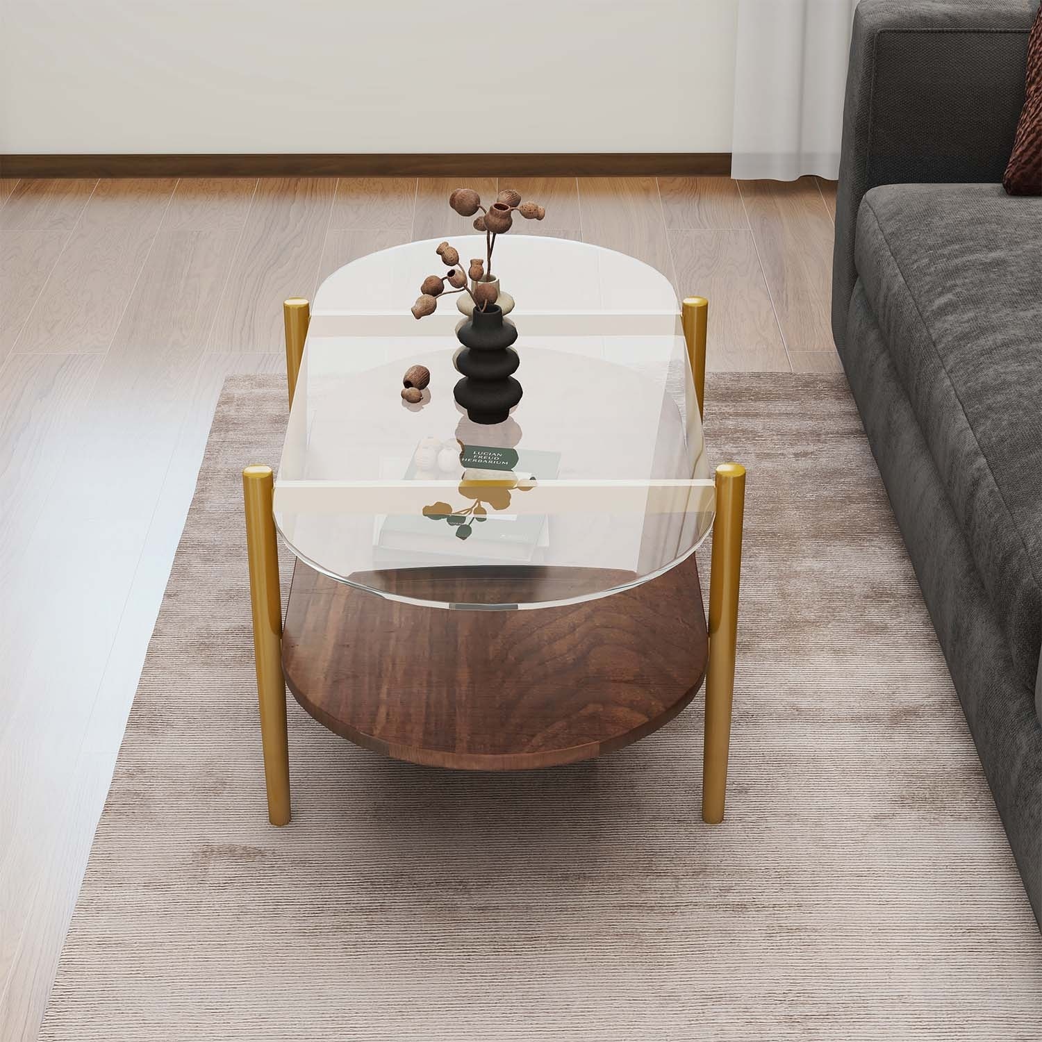 Oval Coffee Table,Double-Layer Storage,Clear Glass Top,Conical Legs with Gold Finish Frame