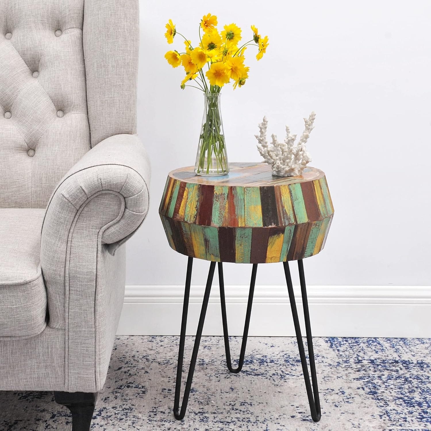 Round Drum Wood Side Table 16x16x21 inch, Reclaimed Rustic Multi Color, Vintage Farmhouse Accent, Indoor Outdoor Use