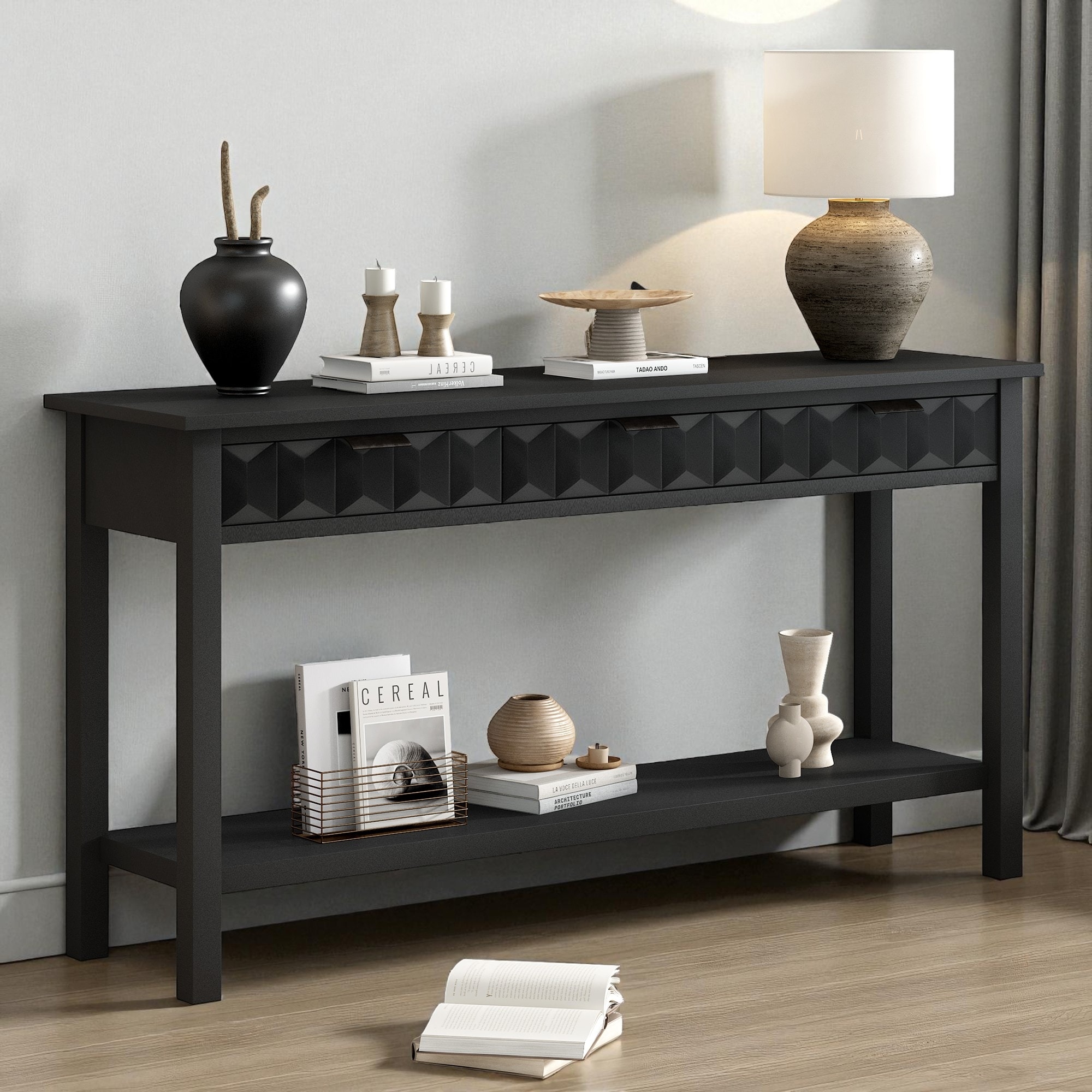 60'' Fir Veneer Console Table with Honeycomb-Patterned Drawers, 3 Storage Drawers and Open Shelf Entryway Table