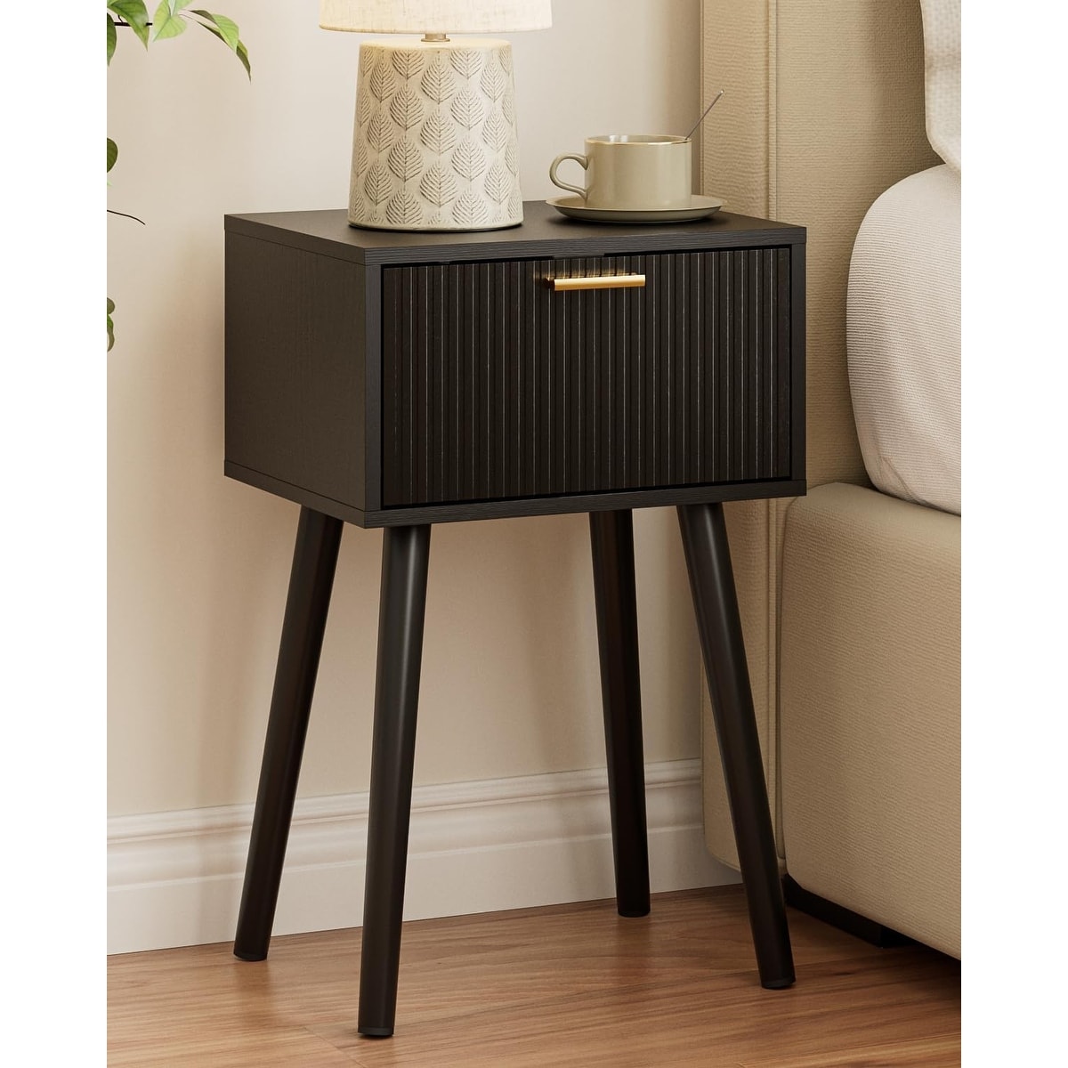 Modern Black Fluted Nightstand with Storage, Compact Bedside Table for Bedroom or Living Room