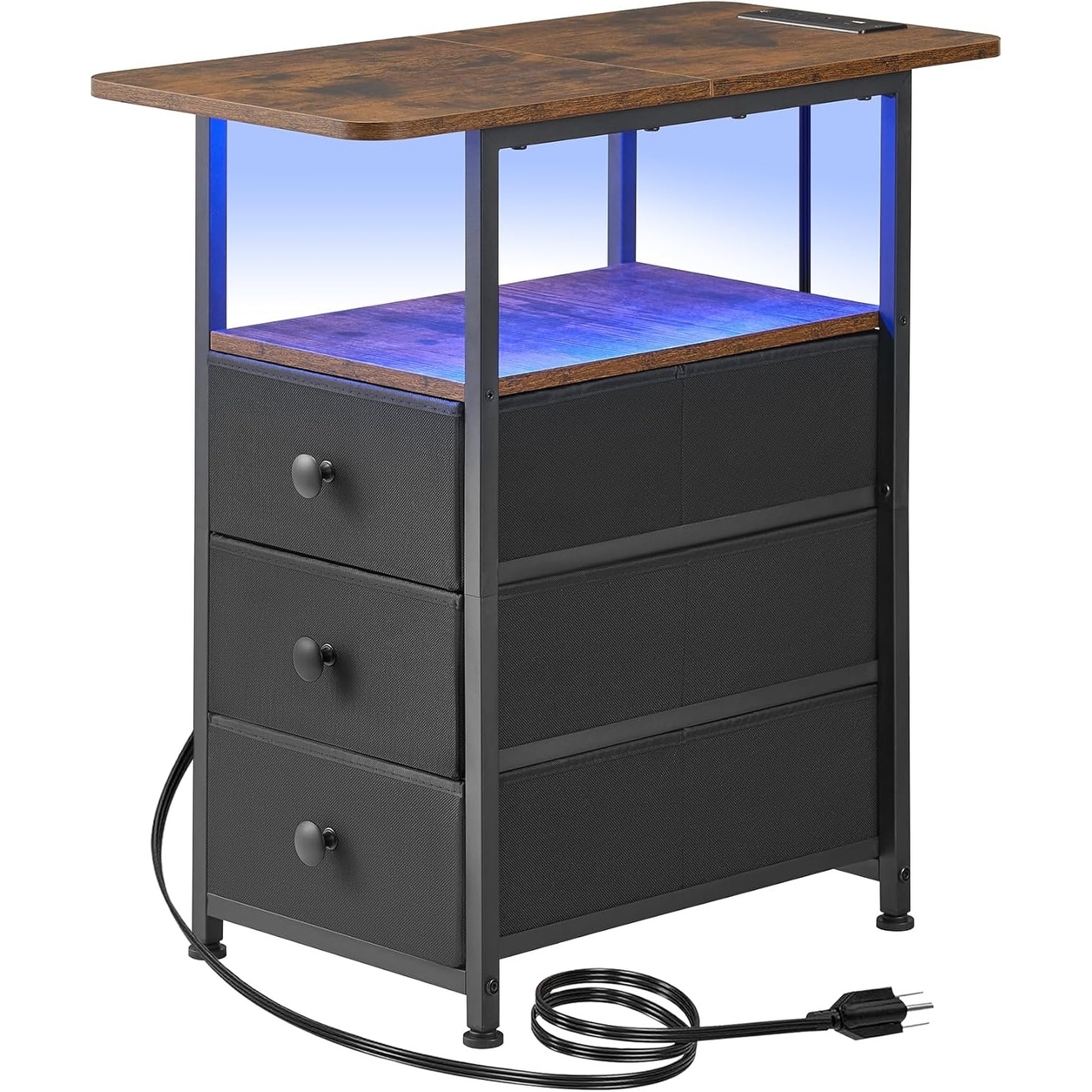 Slim Nightstand with LED Light, Charging Station, and Storage, Rustic Brown