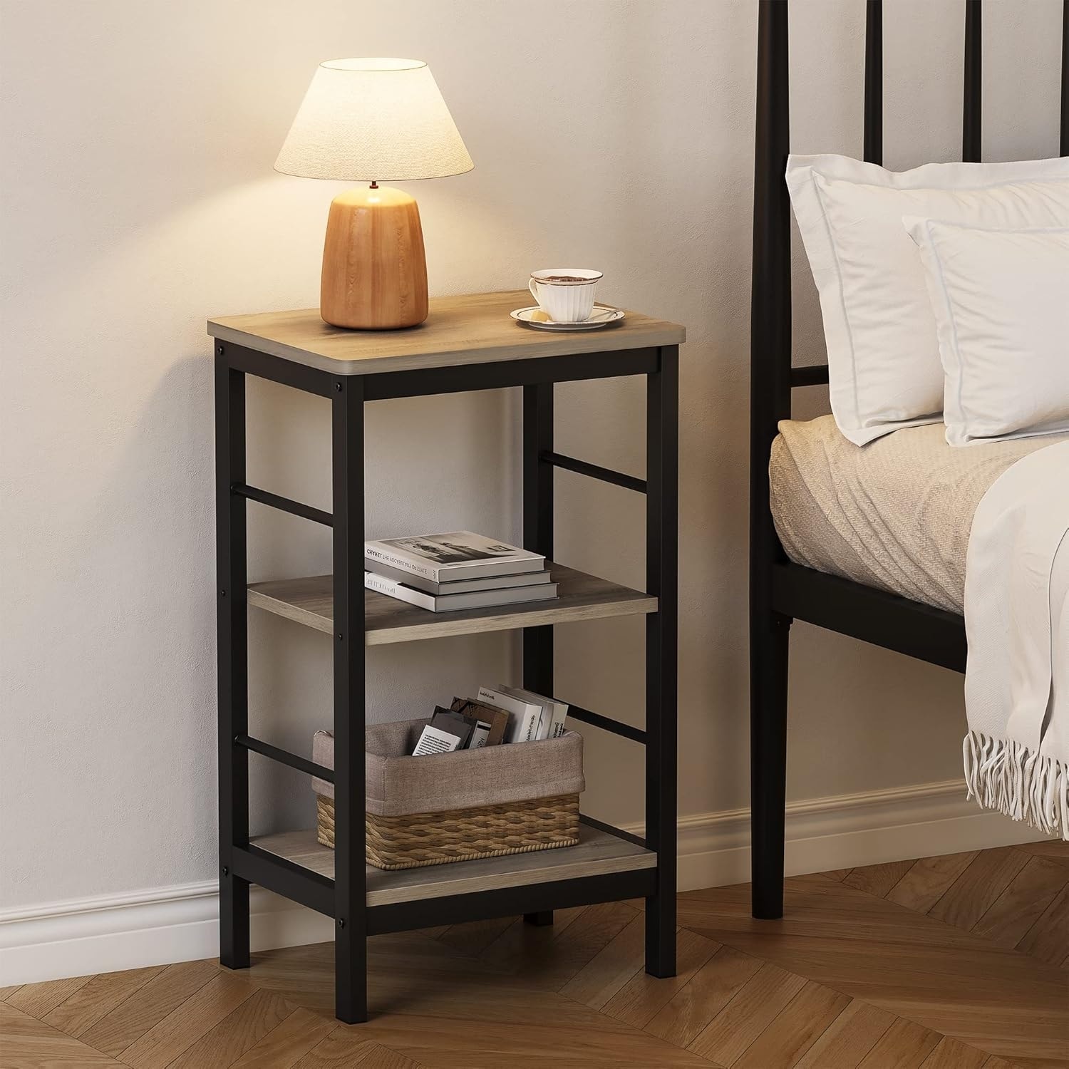 3-Tier Narrow Wooden End Table with Storage, Modern Farmhouse Nightstand for Bedroom & Living Room, Light Brown