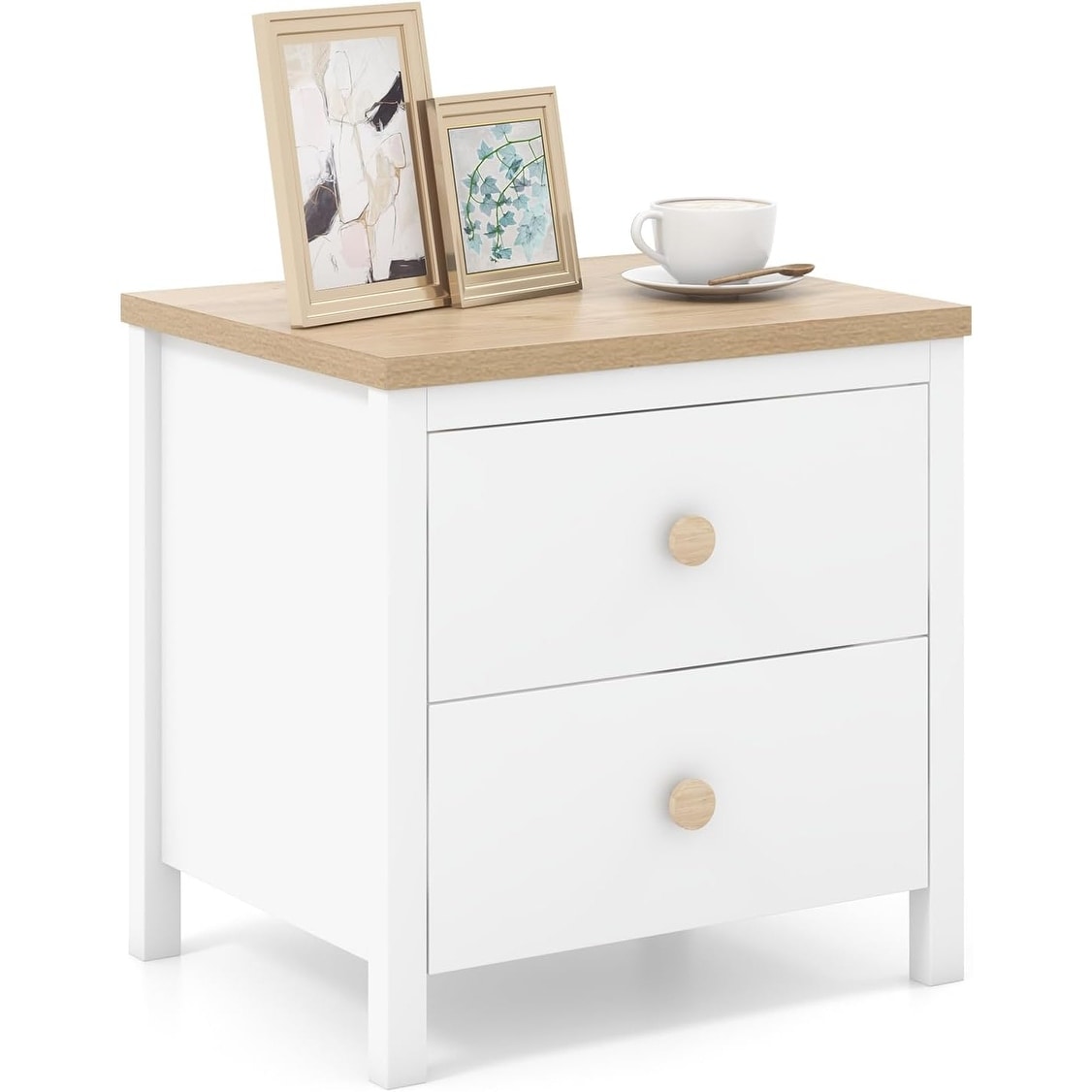 Compact Farmhouse Nightstand with 2 Drawers, Solid Wood Legs, Multifunctional Bedside Table for Bedroom, White