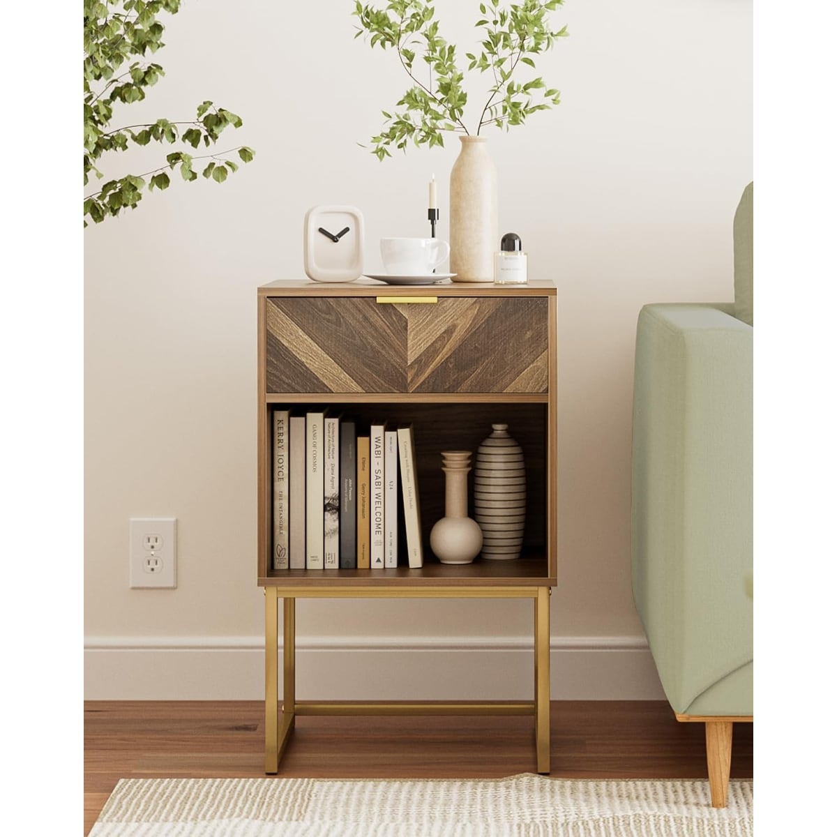 Modern Wood Nightstand with Storage Drawer and Open Shelf, Compact Side Table for Bedroom or Living Room