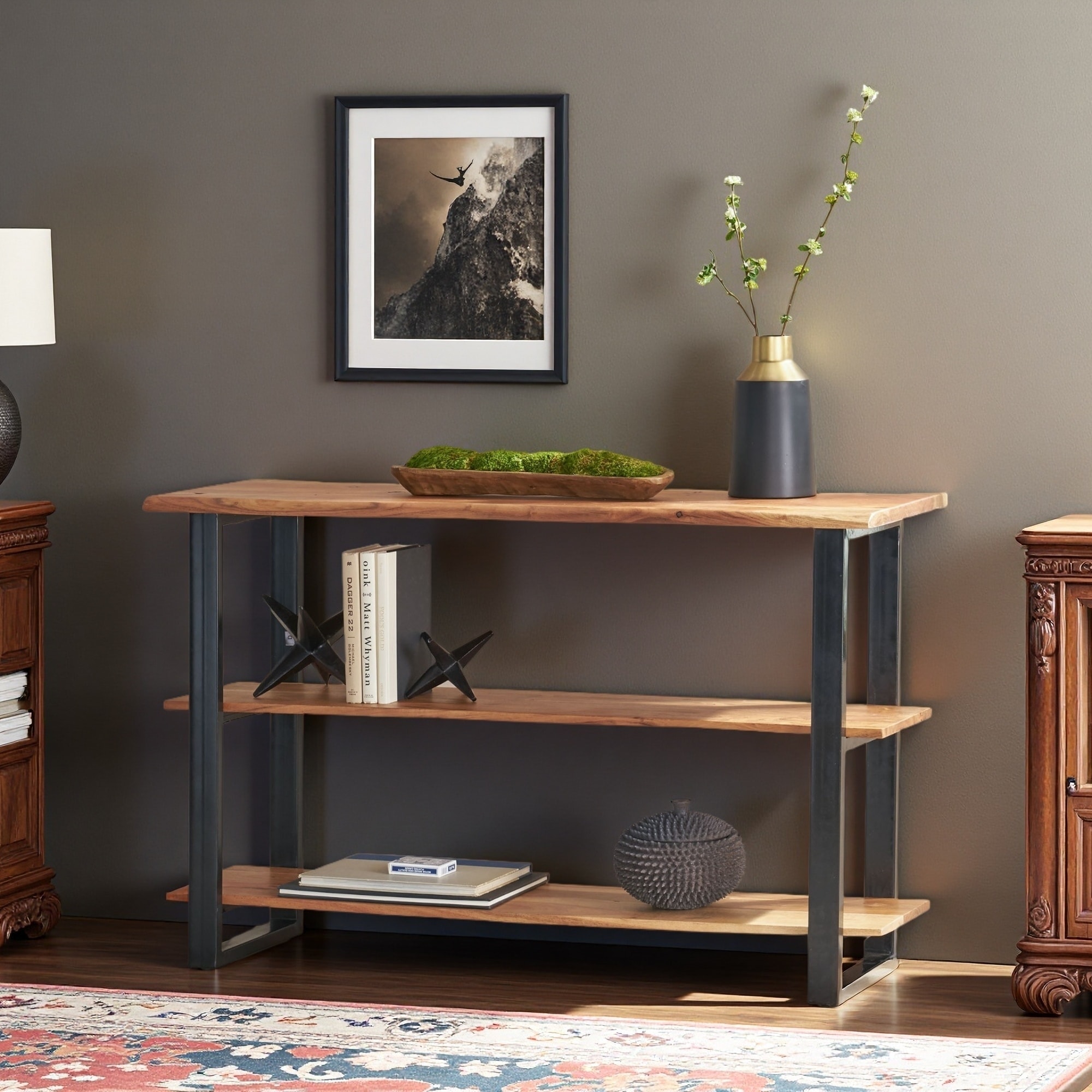 48" Acacia Wood and Iron Media Console Table with Stacked Shelves Handcrafted Modern Industrial Living Room Furniture