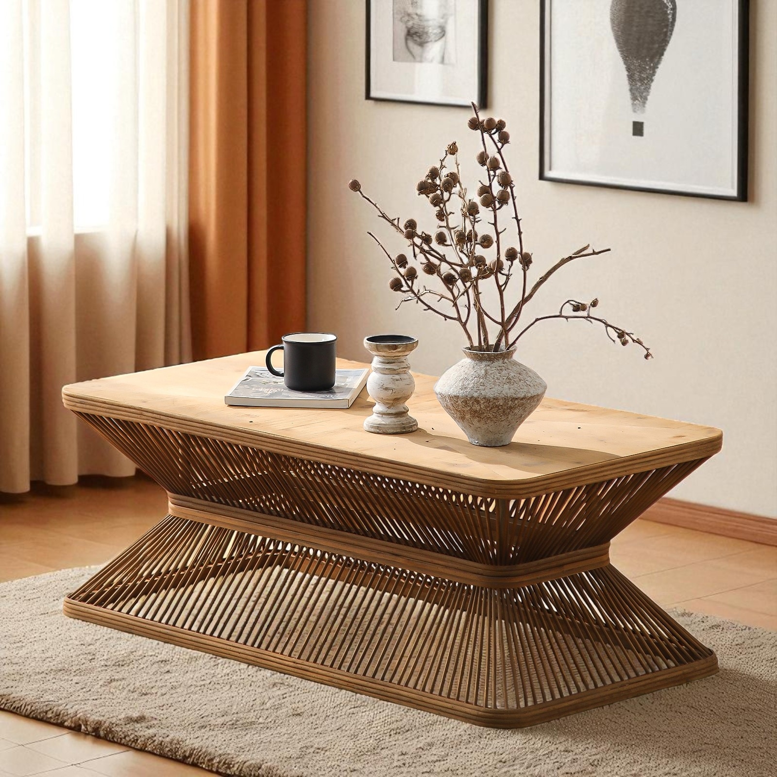 43.3" Mid-Century Modern Coffee Table - Rectangular Wood Accent Table with Woven Bamboo Base, Rustic Boho Style